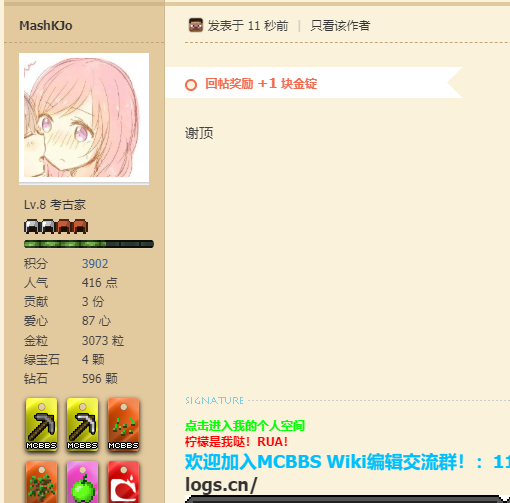 今天五一劳动节闲来无事便想当一次 水 龙 头 (雾),成功升到了7级,也抢了不少锭,收获了mcbbs里第一个爱心,但是也收获了极光哥哥对我的爱(ping fen)。所以还是呼吁大家多多去问答贴等帮助他人而不是在茶馆中氵,茶馆是大家用来分享生活和趣事的地方,也祝mcbbs越来越好!