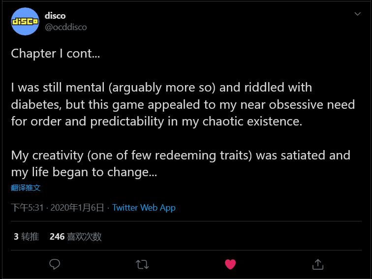 “这时候,我依旧有精神障碍(甚至一度变得更糟),糖尿病也依然在折磨我。但是这个游戏满足了我迫切需求,给予了我在混乱生活中的秩序和盼头。