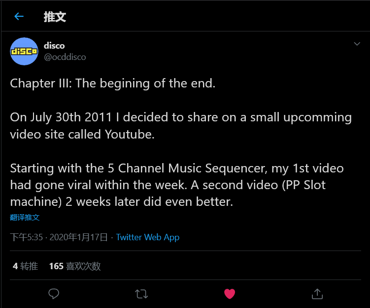 “在2011年7月30号,我打算在一个视频平台分享一个预告视频,这个视频平台的名字叫做Youtube。第一个视频就是一个简单的5通道音乐播放器,但这个视频在一周内得到了病毒式的传播。在两周后发布的第二个视频(老 猪 机)获得了更大的成功。”