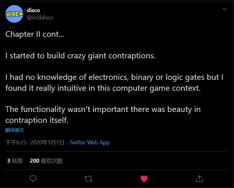“我开始建筑疯狂的、巨大的装置。我对电子学、二进制和逻辑门一窍不通,但是我发现在这个游戏中前面的这些理论都能够非常直观地表现出来。器械的功能并不重要,因为这个器械本身就散发着独特的美感。”