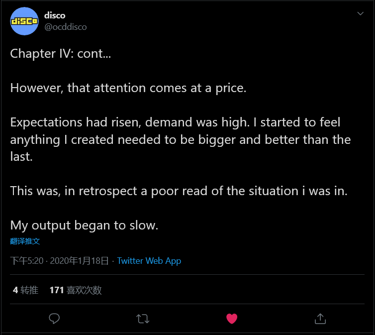 “但是,获得关注是需要付出代价的。人们对你的期望上升了,对你的要求更高了。我开始认为我所做的任何作品都需要比上一个更大更豪华。现在想想,那只是对我所处境遇的粗浅理解。我的作品输出开始放缓。”