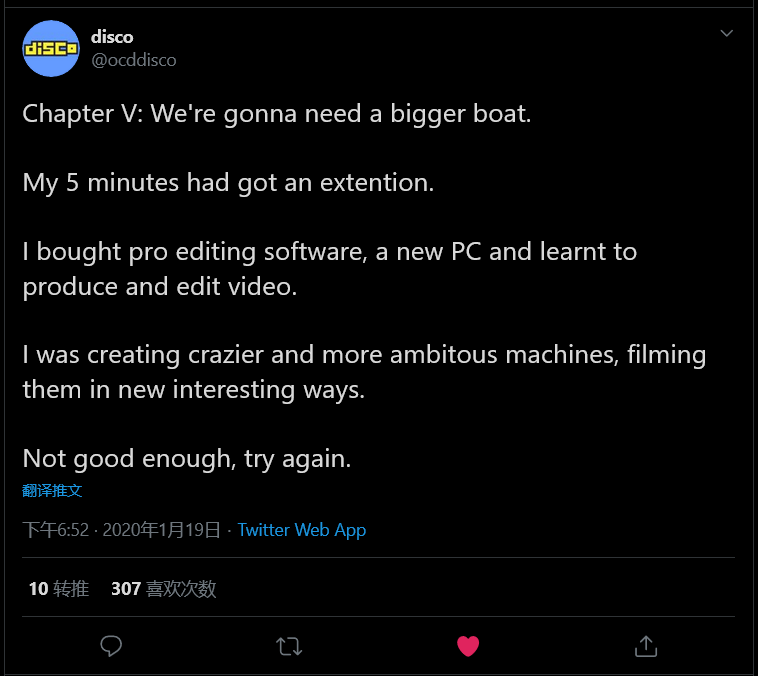 “我的5分钟开始变得更加漫长了。我买了专业视频处理软件,买了一台新的电脑,然后学会了视频编辑与制作。那时的我啊,还在创造更加疯狂的、更具野心的机器,用新颖且有趣的手法来演绎它们。如果不够好,那就重来。”