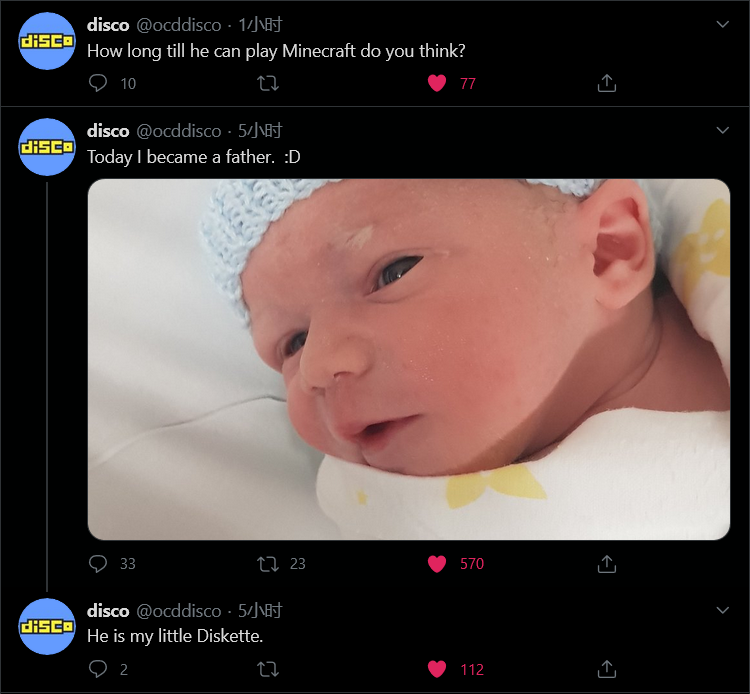 今天刷推特,看到FVDisco(https://twitter.com/ocddisco)今天成为父亲了: