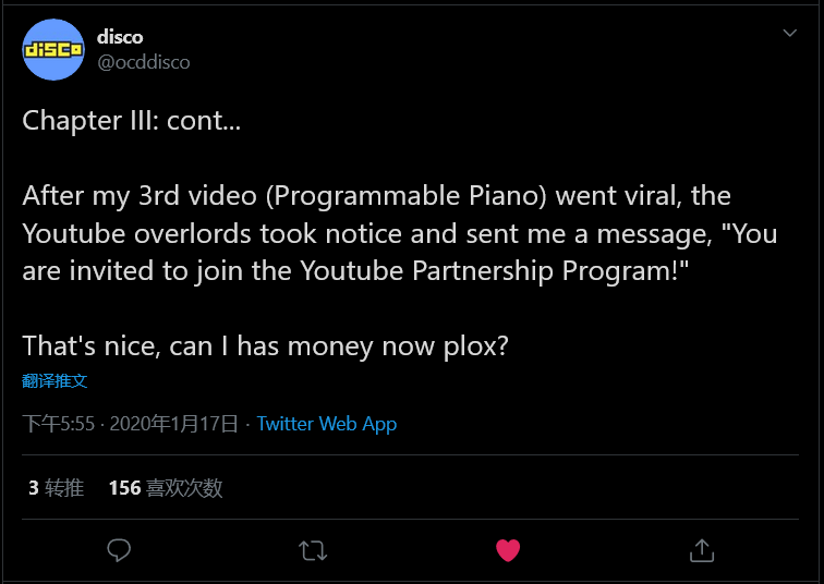 “在我的第三个视频(可编程钢琴)获得流行,Youtube管理员注意到了这点,然后给我发消息:‘邀请您加入YouTube伙伴计划!’确实挺棒的,那请问我现在能获得收益吗?”