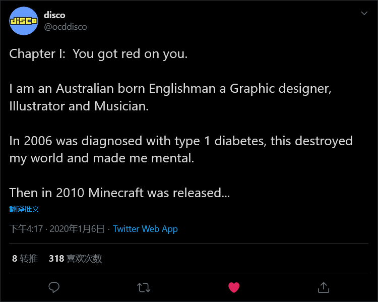 “我是一个澳大利亚人,在英国诞生,是一个视觉设计师、插画家和音乐家。在2006年我确诊I型糖尿病,病魔夺走了我平静的世界,让我变得疯癫。直到2010年,Minecraft诞生了。”
