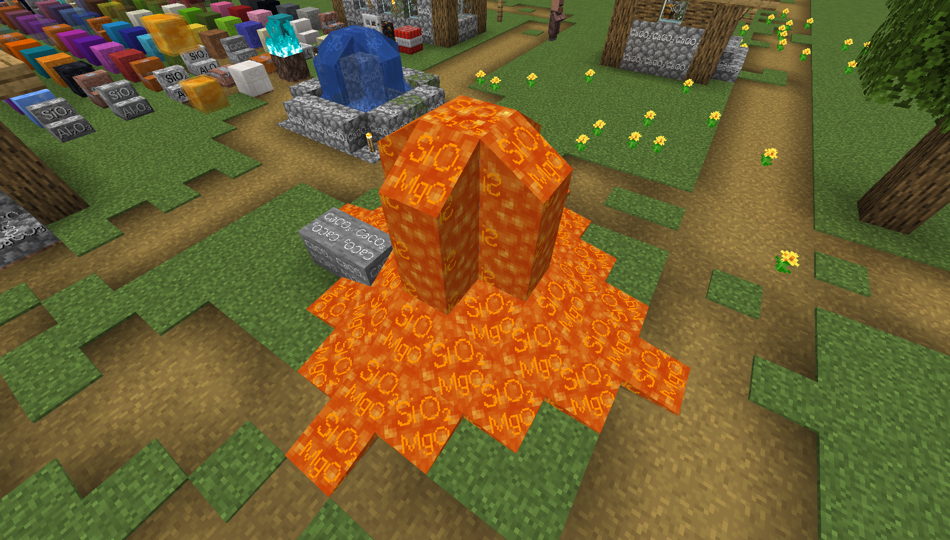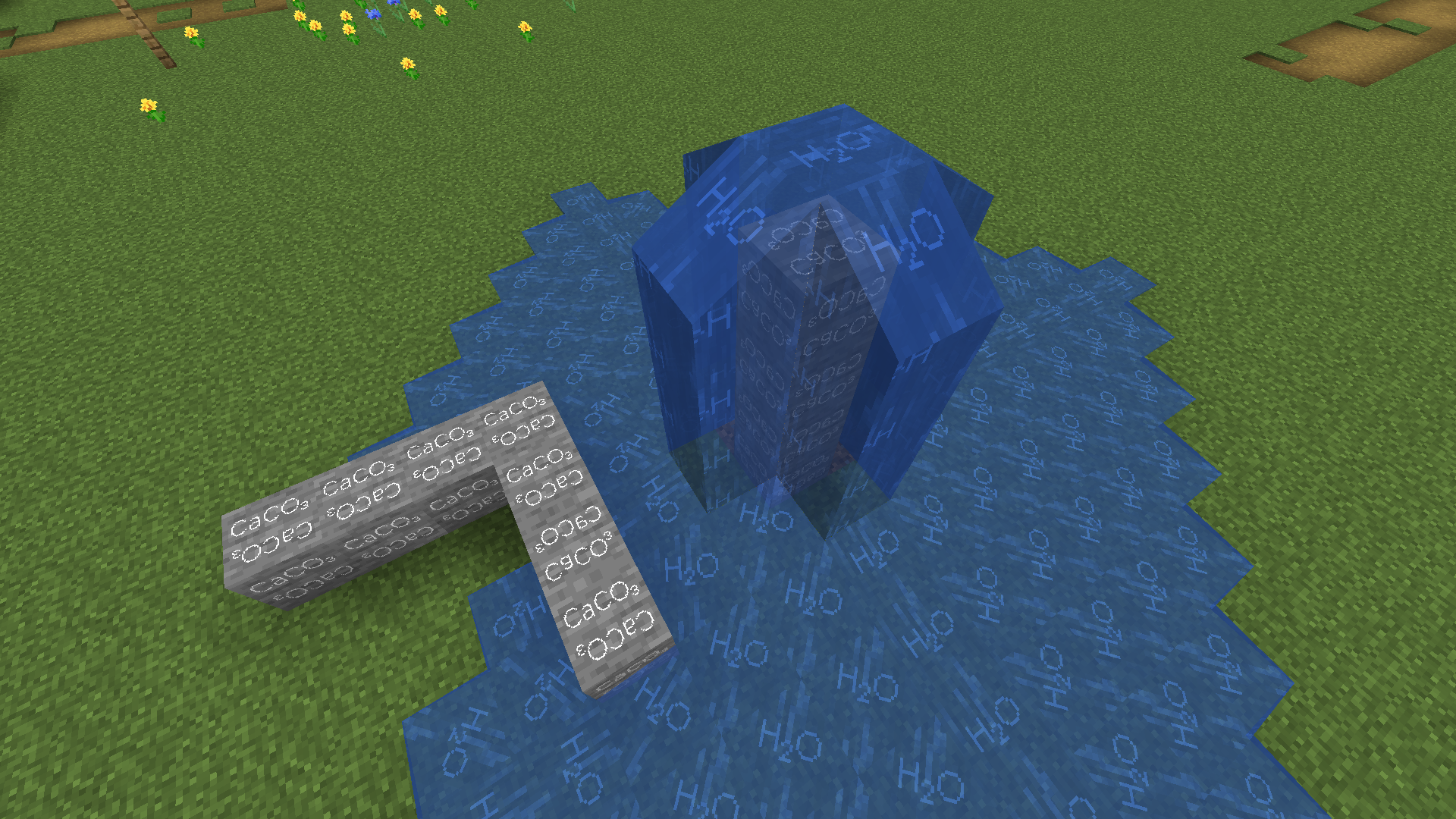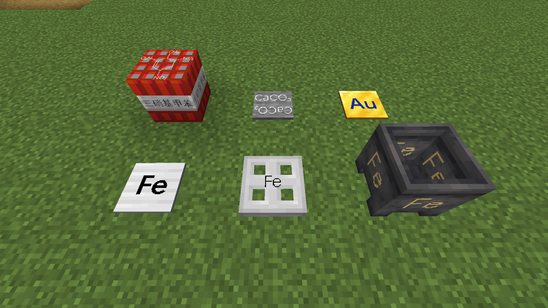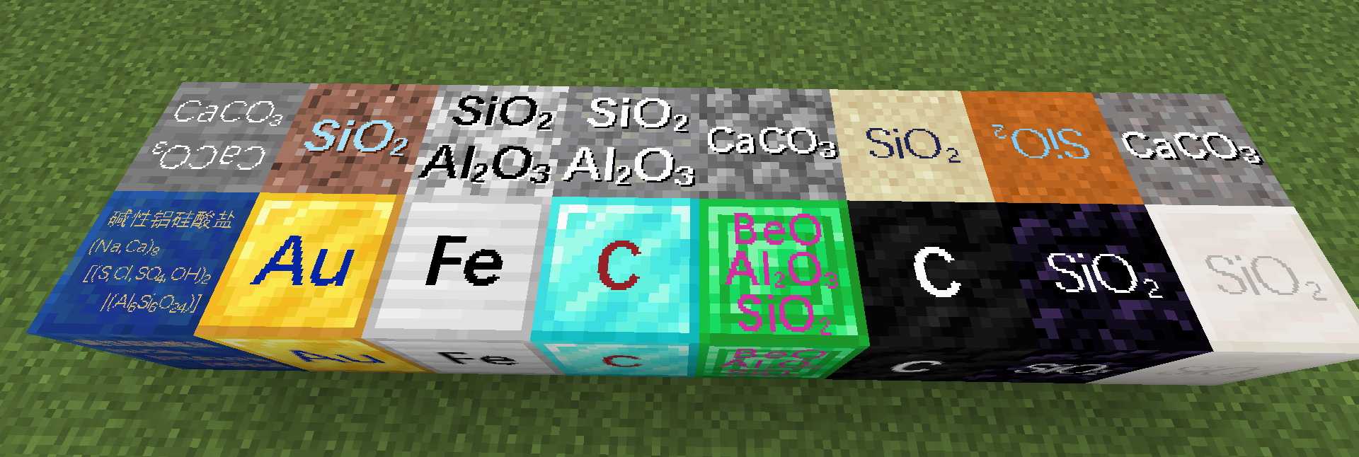 在本材质包中,几乎所有方块都标上了其主要成分的化学式(有生命结构、现实中不存在的除外)