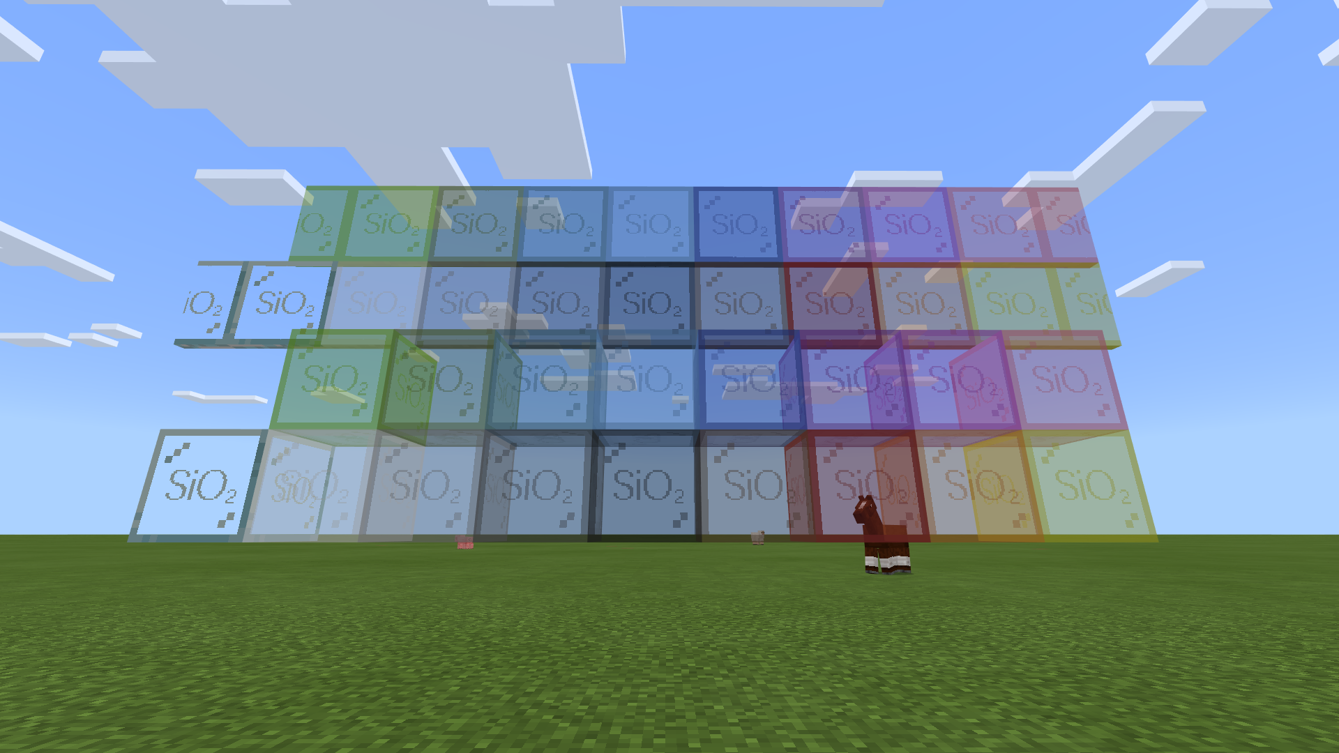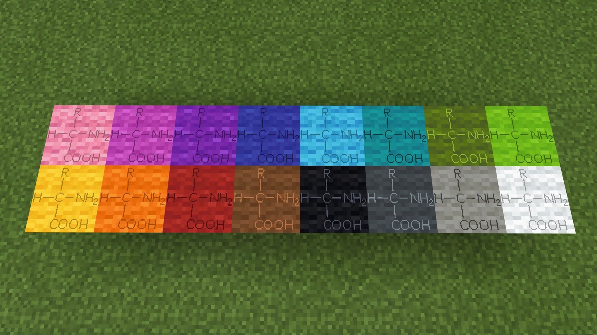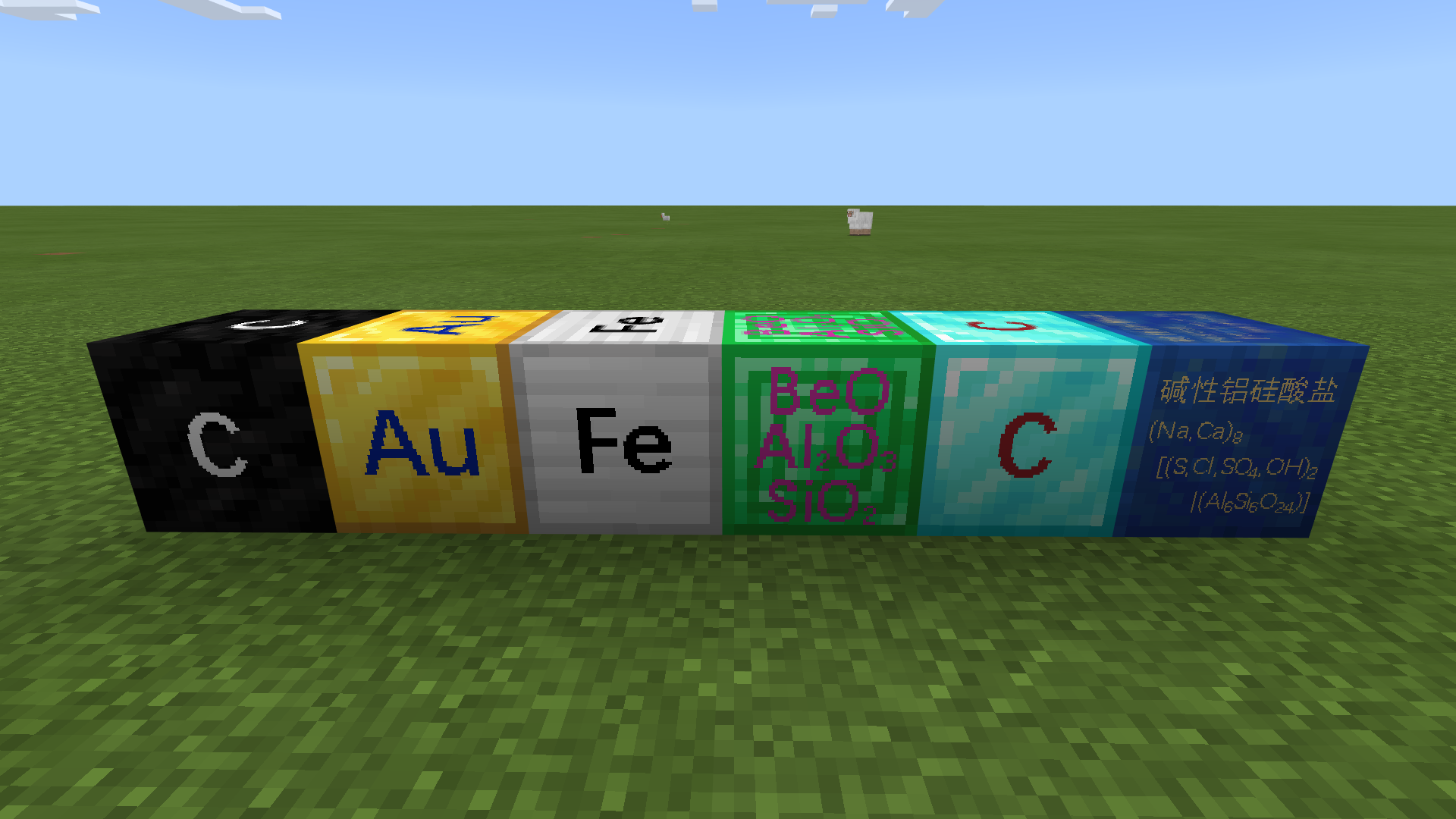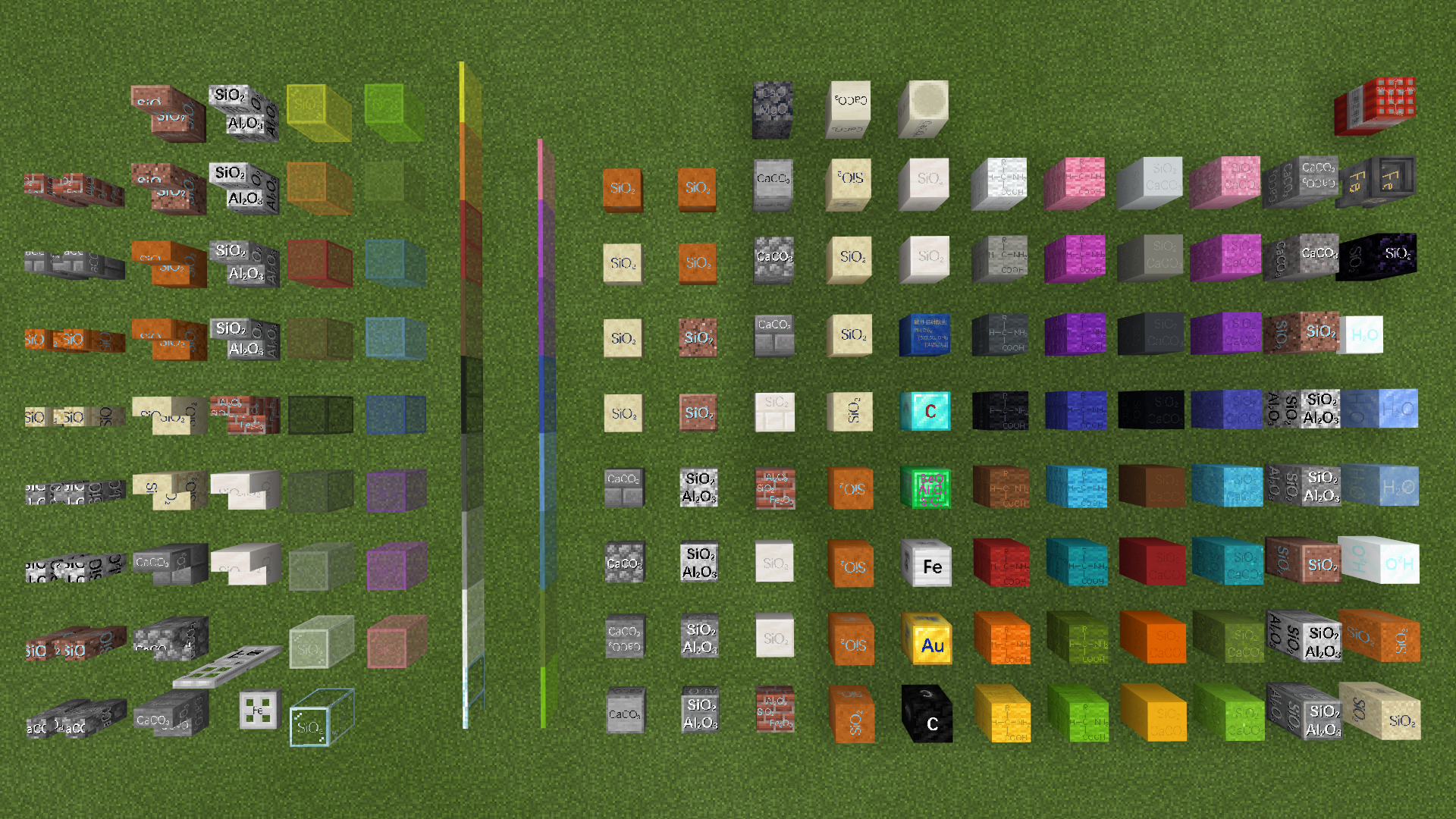 在本材质包中,几乎所有方块都标上了其主要成分的化学式(有生命结构、现实中不存在的除外)