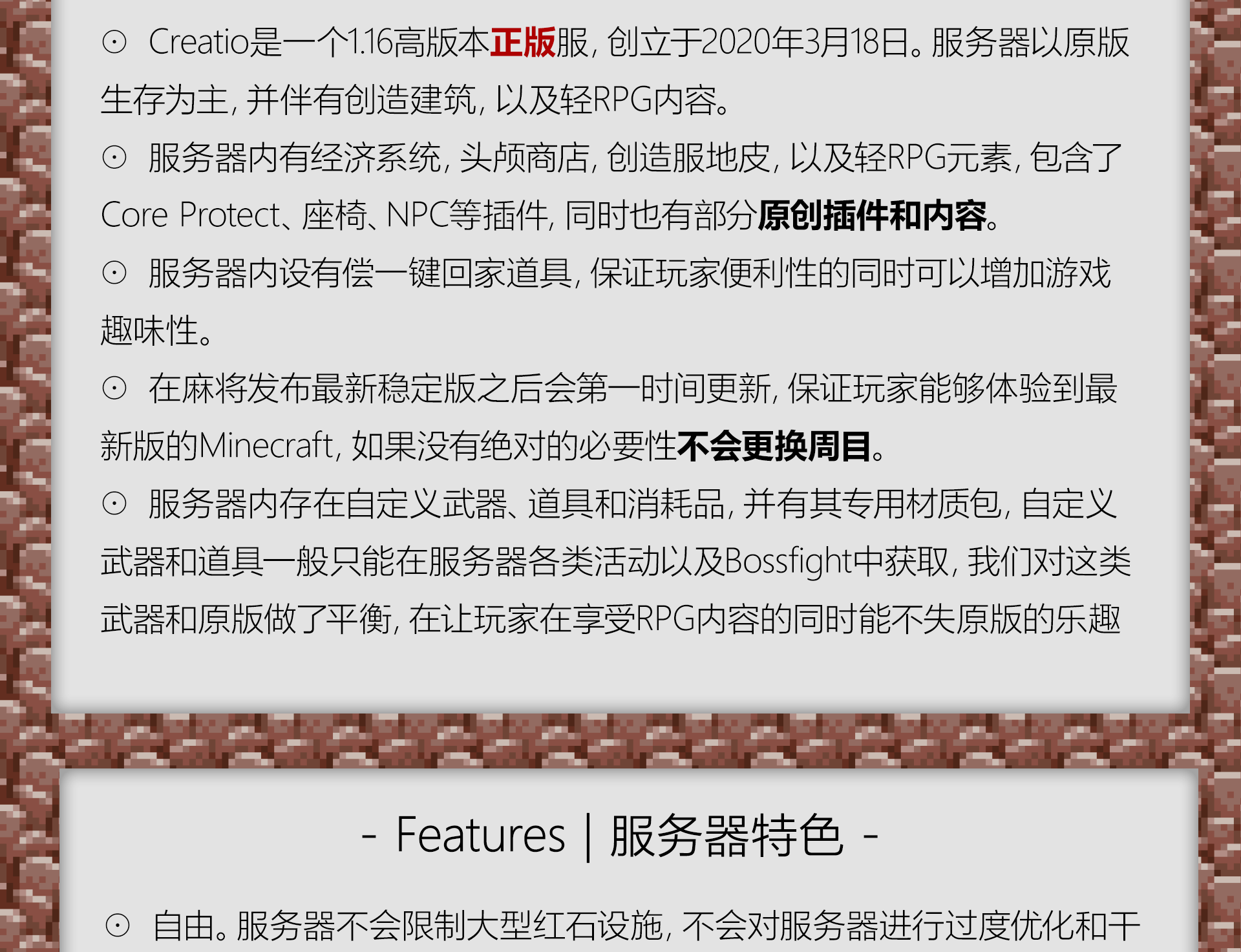 ⊙  Creatio是一个1.16高版本正版服,创立于2020年3月18日。服务器以原版生存为主,并伴有创造建筑,以及轻RPG内容。