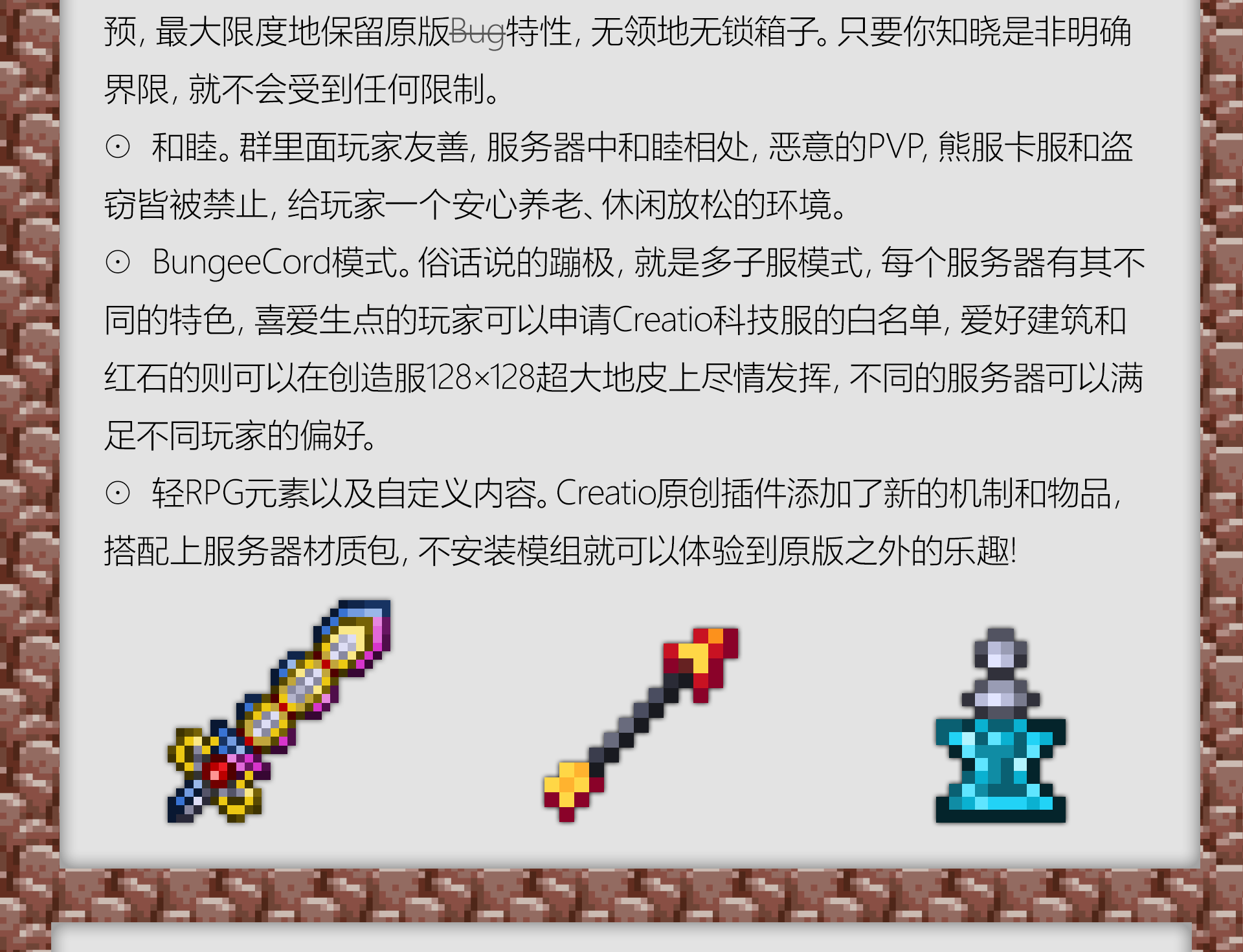 ⊙  轻RPG元素以及自定义内容。Creatio原创插件添加了新的机制和物品,搭配上服务器材质包,不安装模组就可以体验到原版之外的乐趣!