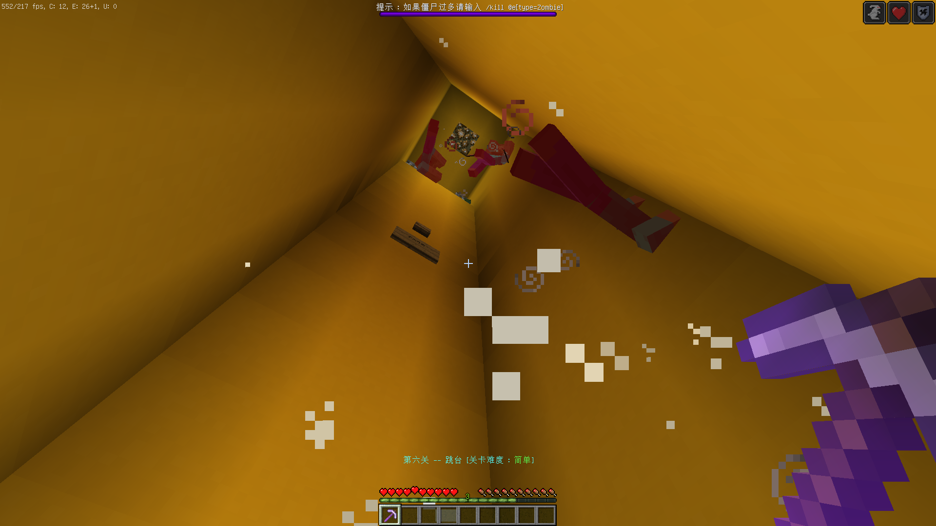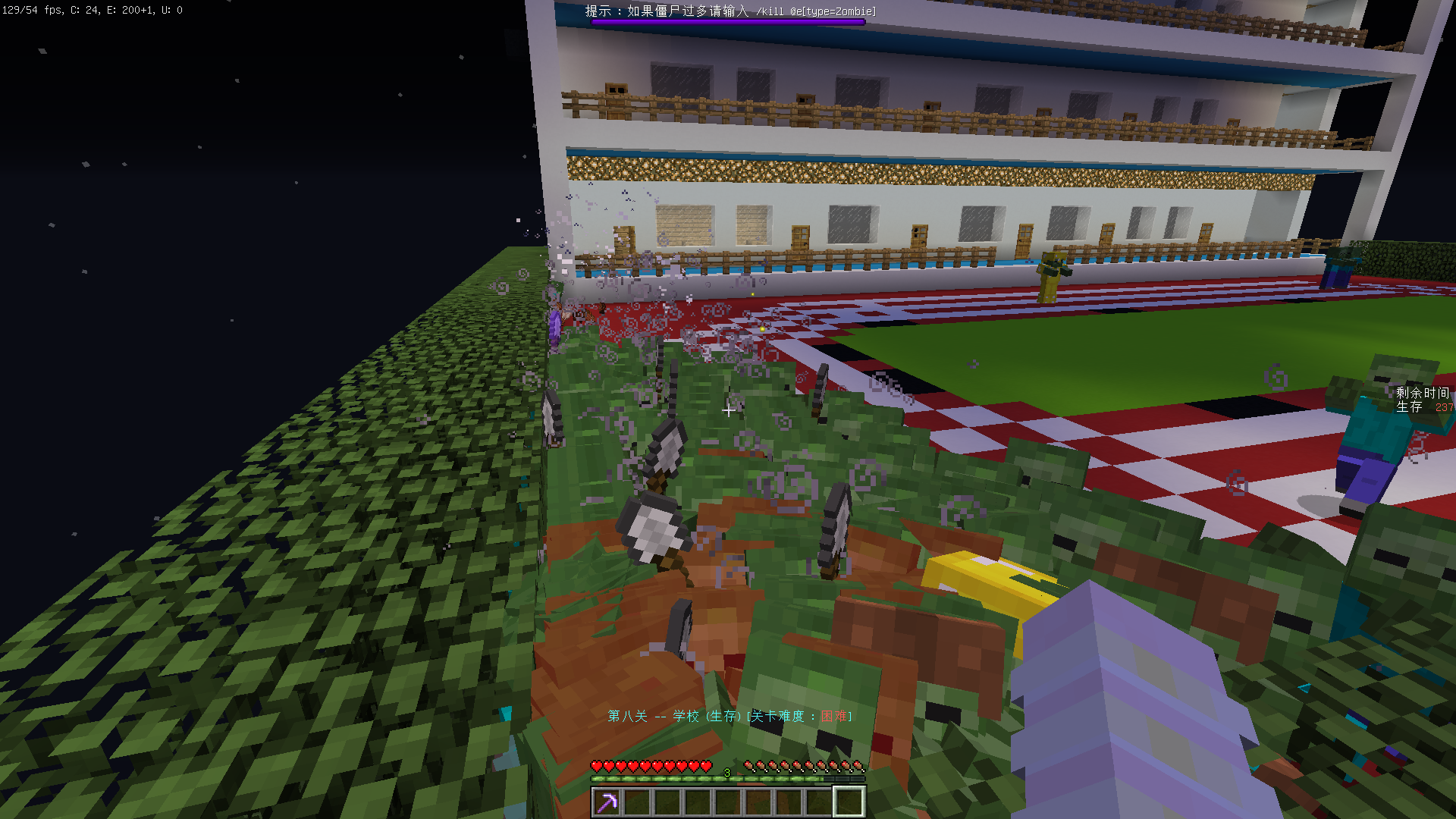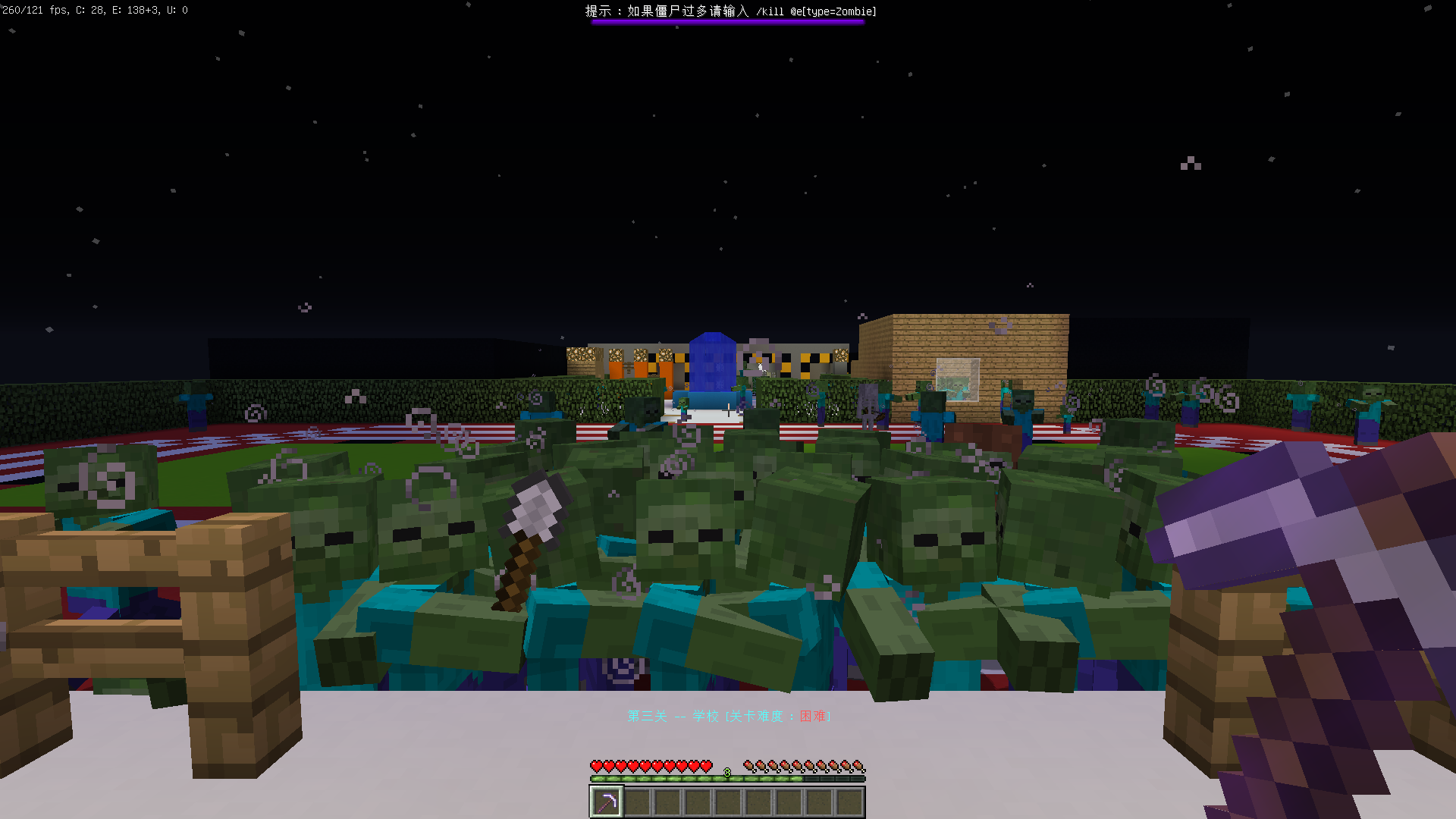 中途如果僵尸特别多导致游戏卡顿,请输入/kill @e[type=Zombie]进行解除,