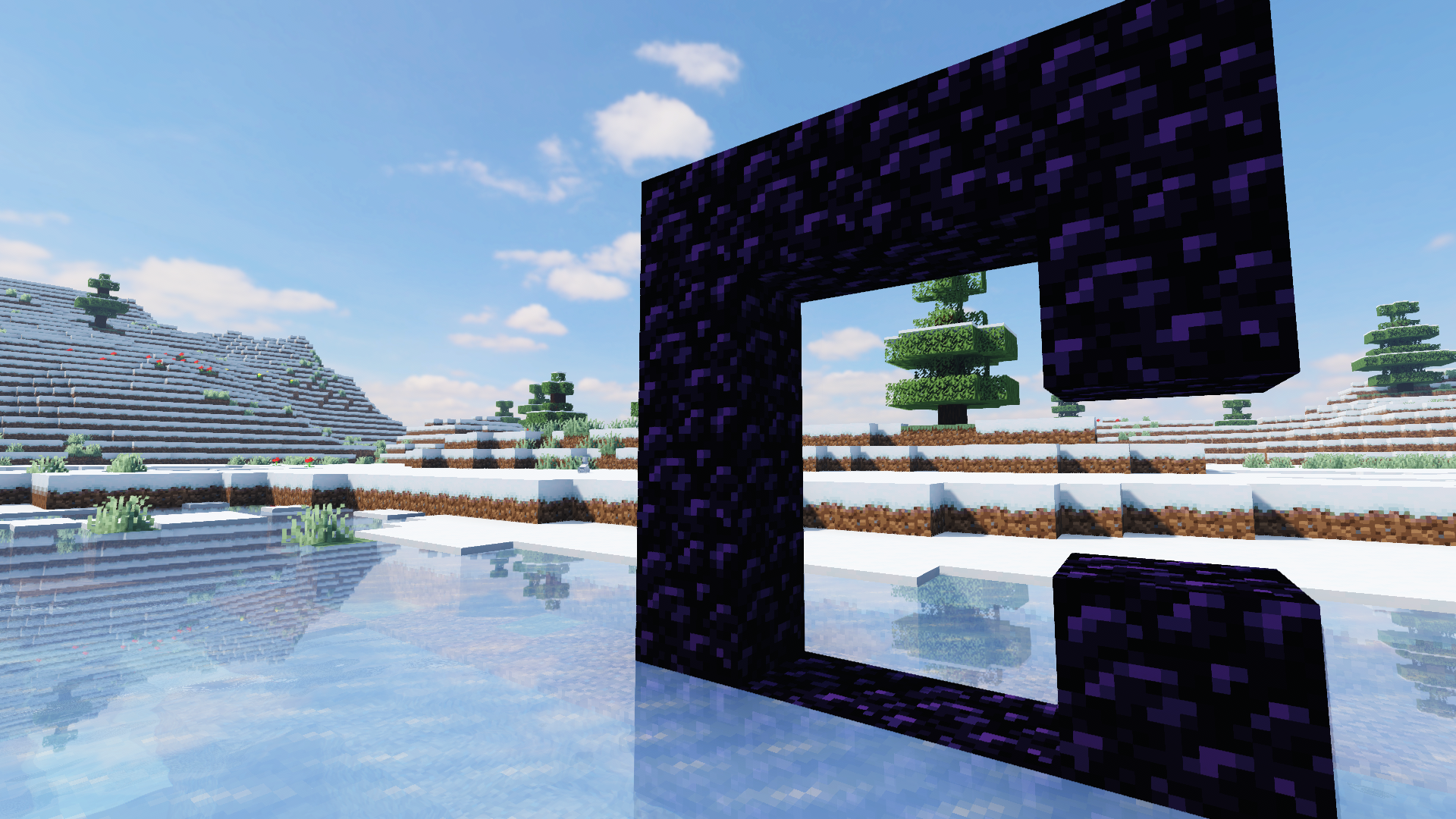 出来就看到冰面的反光(光影的效果真心好),而且周围一片干净的白色,开阔,周围的云杉木星星点点,错落有致,山坡也比较缓,配上光影自带的蓝天白云,和之前去过的地方都不一样,最惊奇的是周围居然还有花,在不远处山坡上有几小片,虞美人有,蒲公英也有。这巧合实在恰到好处,出乎意料地让我发现这个存档还可以有这么美的的奇景。来日有兴致一定在这里搞个雪中的木屋。