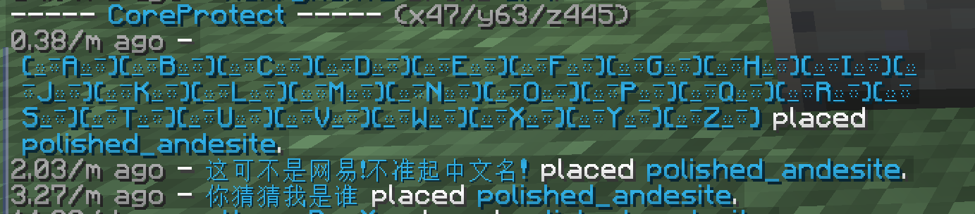 3.对CoreProtect的支持。对于使用CoreProtect的服务器来说,SK里涉及到玩家修改方块的部分会很难受,因为SK的编辑不会被记录到CP的数据库里,而CP没有提供任何可以添加记录的指令,只有一个不学java根本用不了的API,所以我将这个API翻译成了SK表达式:(效果)记录玩家聊天log [core[ ]protect] [player] chat[ting] as %player% with [msg|message] %string%