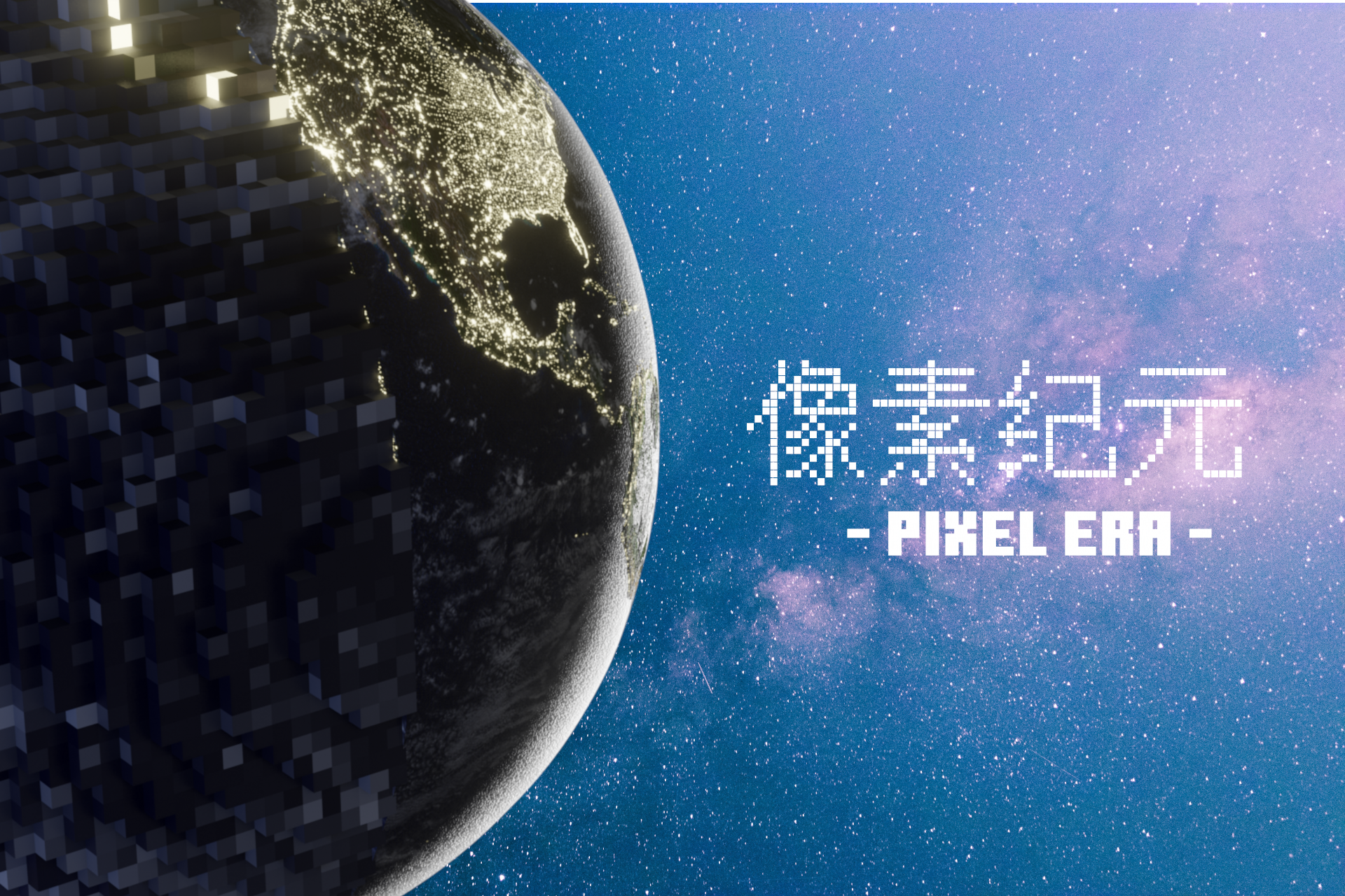 宇宙背景,地球居左,球体是一半Minecraft风格一半现实风格,