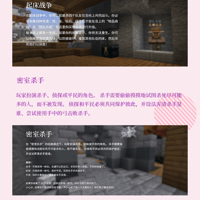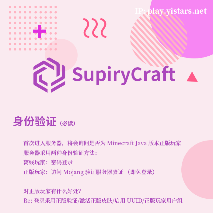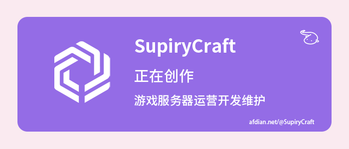 身份验证(必读) 首次进入服务器,将会询问是否为 Minecraft Java 版本 正版玩家 服务器采用两种身份验证方法: 离线玩家:密码登录 正版玩家:访问 Mojang 验证服务器验证 (即免登录) 对正版玩家有什么好处? Re: 登录采用正版验证/激活正版皮肤/启用 UUID/正版玩家用户组 使用正版登录的玩家,可以使用 基岩版(包括 win10 版) 登录服务器。 此项功能仅限 Java 版正版玩家,不须为 基岩版 正版。 空岛生存 空岛服务器经过详细的自定义配置,相对老版的空岛有非常多的区别 RPG RPG 将与空岛生存部分联合,部分物品可以实现跨服传送,部分任务可以 在空岛生存完成。但 RPG 部分不完全依赖于空岛生存,但 RPG 的入口 设定在了空岛生存服。 起床战争 其实已经做了大半年了,但是由于等插件更新等了很久,在最近才买到最新版 的插件。应该要不了多长时间,就能够体验到海皮咳嗽风格的起床战争了。 还有点想说的 这回服务器从租服变成了自己买实体服务器用,相比之前应该有了不少的 提升,至少不会因为没钱续费就停机了。感觉以后除了不可抗力或者精力 问题应该就不会那么容易关了。 宣传帖的文字我也不是特别想描述,还是欢迎大家去服务器体验一下吧。 因为还要学习,所以不少游戏内容都得等一段时间才能玩到(也就是没 开放),等呗,质量反正不会太差。 关于反作弊,竞技类的服务器(比如起床战争之类的)是肯定会装的,也 会偶尔有管理员来人工处理。 服务器支持正版玩家登录,也支持基岩版登录(不同平台登录服务器,但 同服游戏),能算是一个比较特别的特色了。也做了不少自动化的东西, 至少不用管理员一直盯着了。(IP 和 端口在群公告里也有) 还是希望有些老玩家能够留在服务器群里,情怀为主吧。本身开这个服就 本身不指望能回多少本,现在有点资本就开个服圆了当年的情怀。 希望大家加个群:513097408(不是必须加),啥事在群里说,建议也好, 意见也罢,能沟通都是好事。俩管理员都算是有好几年的技术基础了, 能办到的都尽可能办到吧。 其他游戏 密室杀手、空岛战争... (正在策划或开发,暂时不开放) 赞助服务器 https://www.afdian.net/@SupiryCraft |