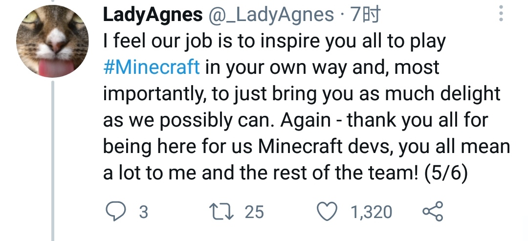 我认为我们的工作就是激励大家以自己的方式去玩Minecraft,而最重要的是尽我们所能为你们带来更多的快乐。再次感谢你们陪伴着我们Minecraft开发者,你们的存在对我和其他团队成员来说都很重要!
