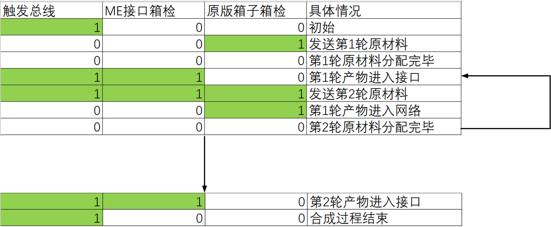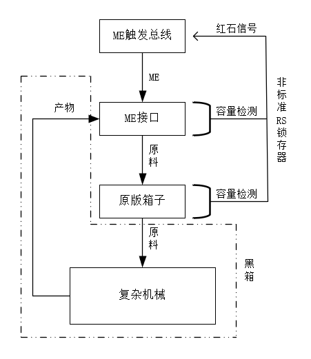 详细解析了合成过程的触发总线、ME接口以及箱子的变化之后,我们就需要开始设计这样的红石电路了,为了直观看到各变量的变化,我们可以将上述过程总结成下图所示: