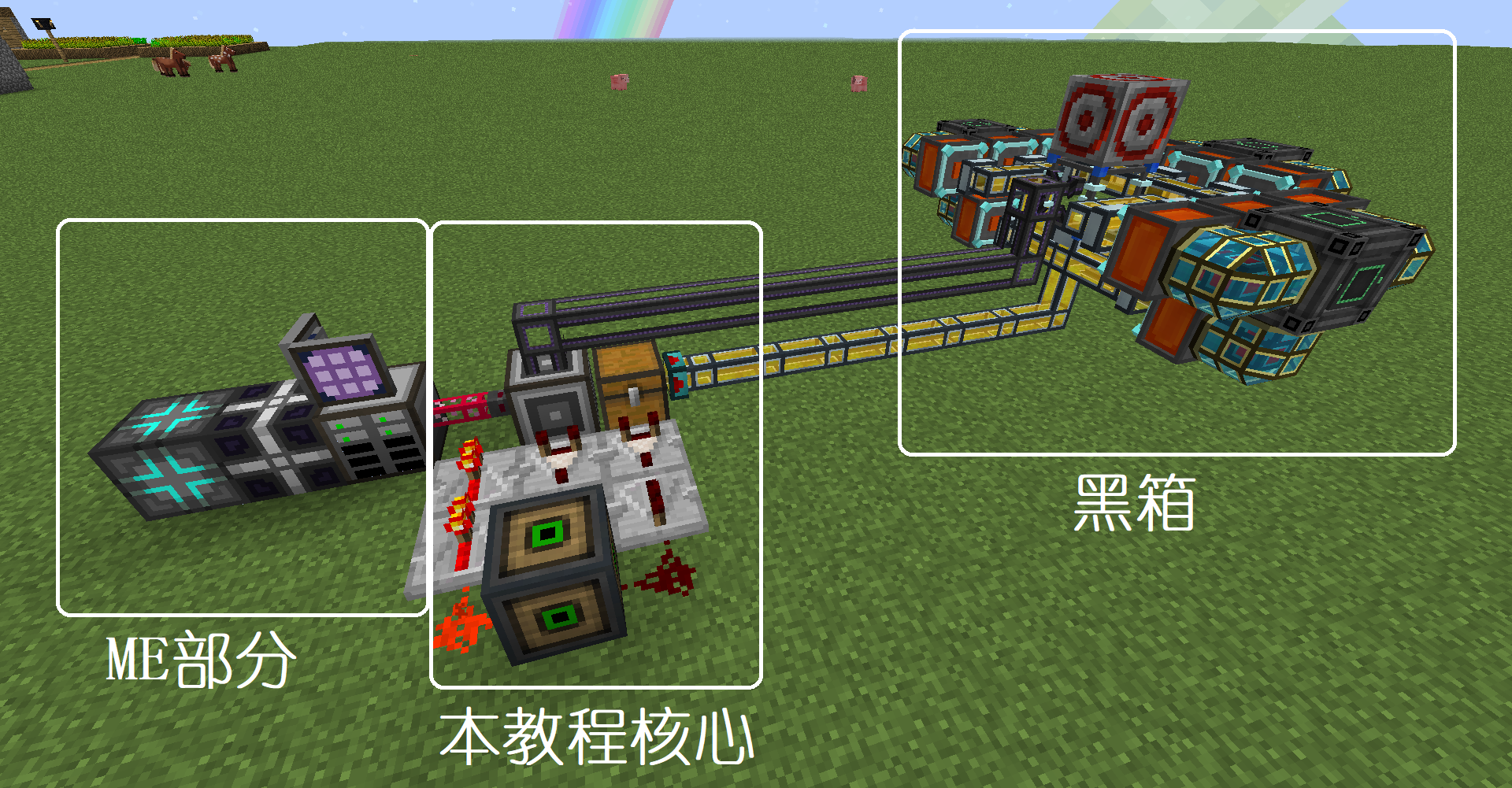 )搭建一个“广义阻塞ME接口系统”。    目录:待完善……Tips? 不想看我跟水壶里的饺子——倒不出来一样的论述的话,可以直奔最后一页! 本教程不适合没有玩过广义自动化的AE2新手!你至少应该知道ME接口的三个作用并在游戏中实际使用过、了解到其阻塞模式的不足! 本教程也不适合大佬萌新、巨佬咸鱼!!! 本教程的最初想法来自安逸菌大大,可惜的是,有一个比较致命的问题并没有被考虑到,直接导致合成复杂物品时每一层都会卡一下。具体原因会在下文介绍到。 本教程之所以称为“广义阻塞模式”,是因为全程只用到了原版红石(为了呈现简洁,先用了压缩空间减小RS锁存器的体积,后面会拆开介绍并给出纯原版红石的电路结构)和AE2,至于后面黑箱部分使用的热力管道和龙之研究,它们只是黑箱而已,换成其他mod也完全没问题。 详细解析在下一页!!!