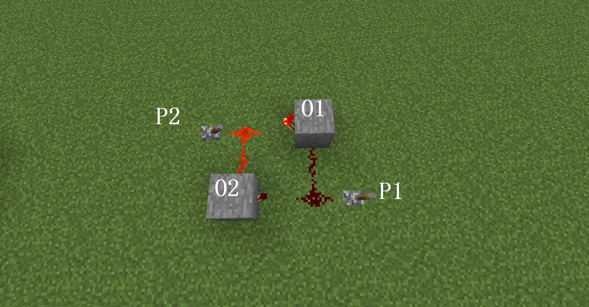 可以看到,P1是O1的R端(Reset)、O2的S端(Set),当P1产生红石脉冲的时候,O1会被强制拉回0,O2会被强制抬到1,P2的作用与P1正好相反。这是数电的内容,不赘述。