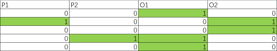 然后调整其P1、P2两个输入端,观察O1、O2两个输出端的输出情况,如下图所示: