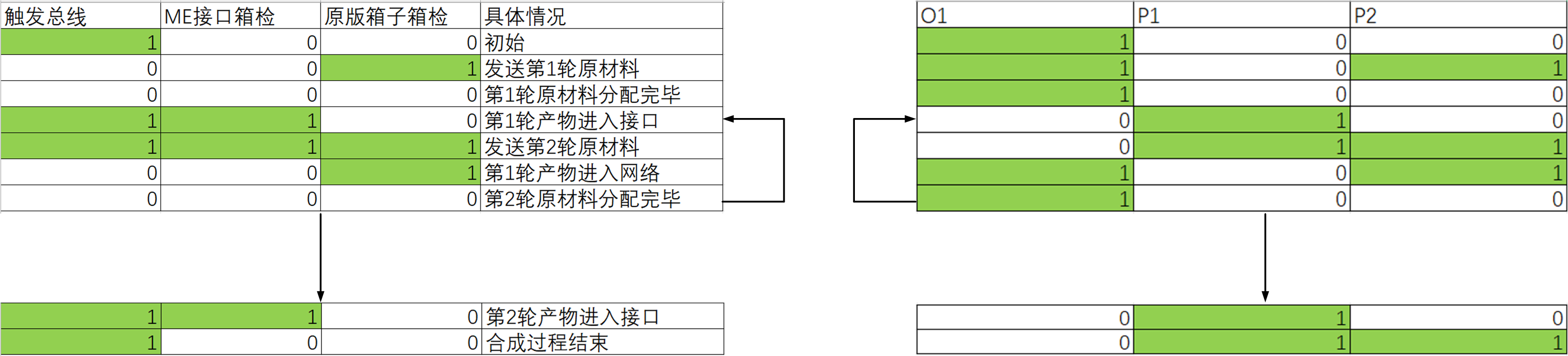 在箱子内被发送了第2份原材料的时候,ME触发总线始终处于激活状态,箱子内原材料也处于被分发的状态。