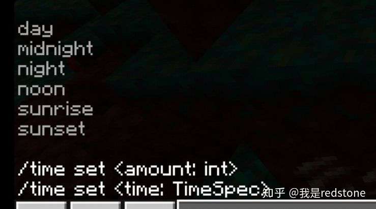 /time set + 时间段意思是将我的世界中的时间段调整为改时间段时间段有一下几个: day-白天midnight-午夜noon-正午sunrise-日出sunset-日落
