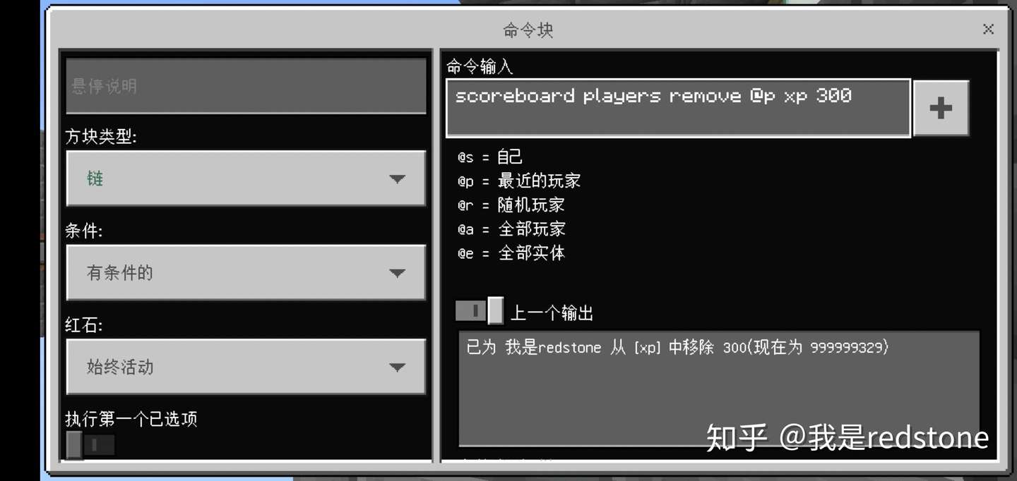 将玩家的分数随机设置命令:/scoreboard players random <目标:目标> <内部名:字符串> <最大值:整数> <最小值:整数>例如将玩家:我是redstone的分数 xp 随机设置到1-100 之间/scoreboard players random 我是redstone xp 1 100一、测试、列出玩家的计分板分数1、测试玩家计分板分数格式:/scoreboard players test [玩家] [记分板项目] [MAX] [MIN]例如测试玩家Steve的c记分板的分数是否高于10,低于100 : /scoreboard players test Steve c 100 10这个可以用于系统商店这是一个系统商店的命令方块: 命令块1