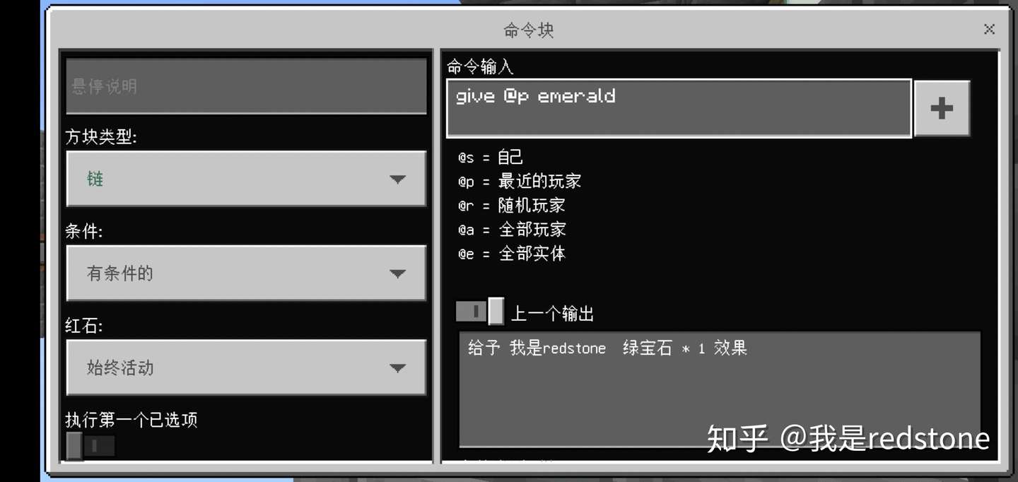 是否条件的有条件的是指在前面一个命令块执行成功之后才可以执行的命令块,无条件的则反之是否需要红石需要红石是指在有红石信号才可以执行的命令块,无需红石则反之