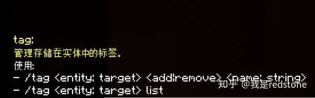 用法1:/tag 实体 add/remove 标签名称add是添加,remove是移除tag可以作为目标选择器的标签使用例如:/testfor @a[tag=Minecraft_Lover]探测是否有Minecraft_Lover标签的玩家