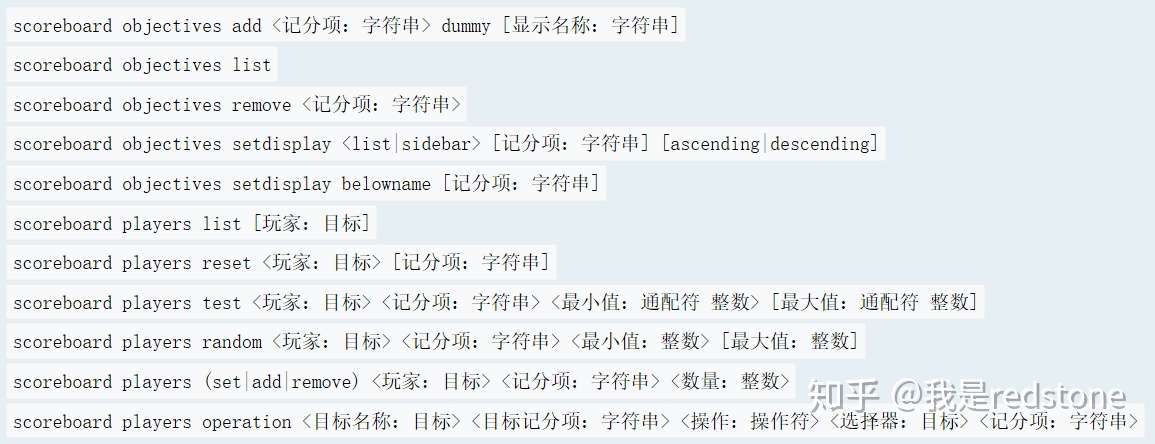 /scoreboard命令的用法,图片截自Minecraft Wiki建/删除计分板的命令格式:scoreboard objectives add/remove <内部名:字符串> dummy [显示名:字符串]如果第三个参数设置为add,则为添加计分板;设置为remove则反之举例:创建一个显示名为"积分",内部名为"xp"的计分板/scoreboard objectives add xp dummy 积分