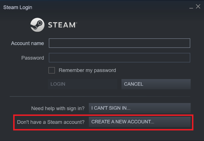 To create your own Steam account, please visit the Steam sign-up page. You can also create an account from the Steam Launcher, once you have it downloaded (shown below).