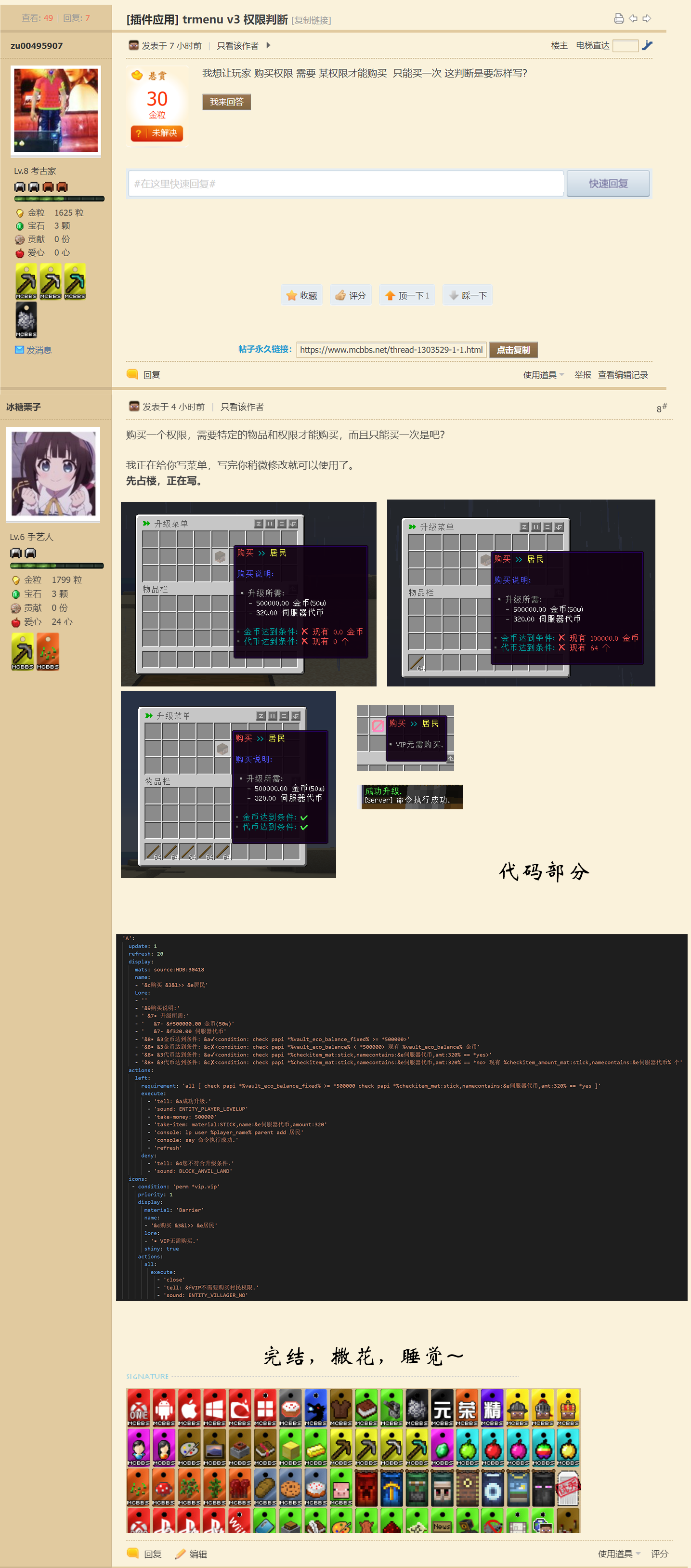 我是要让玩家用菜单 购买 权限 扣除 游戏币 扣除物品 判断玩家是否有那权限 有就不能买 ...