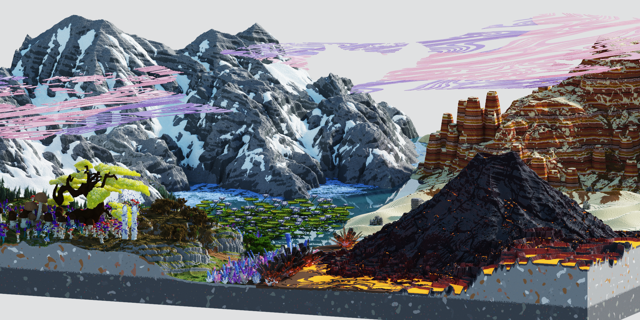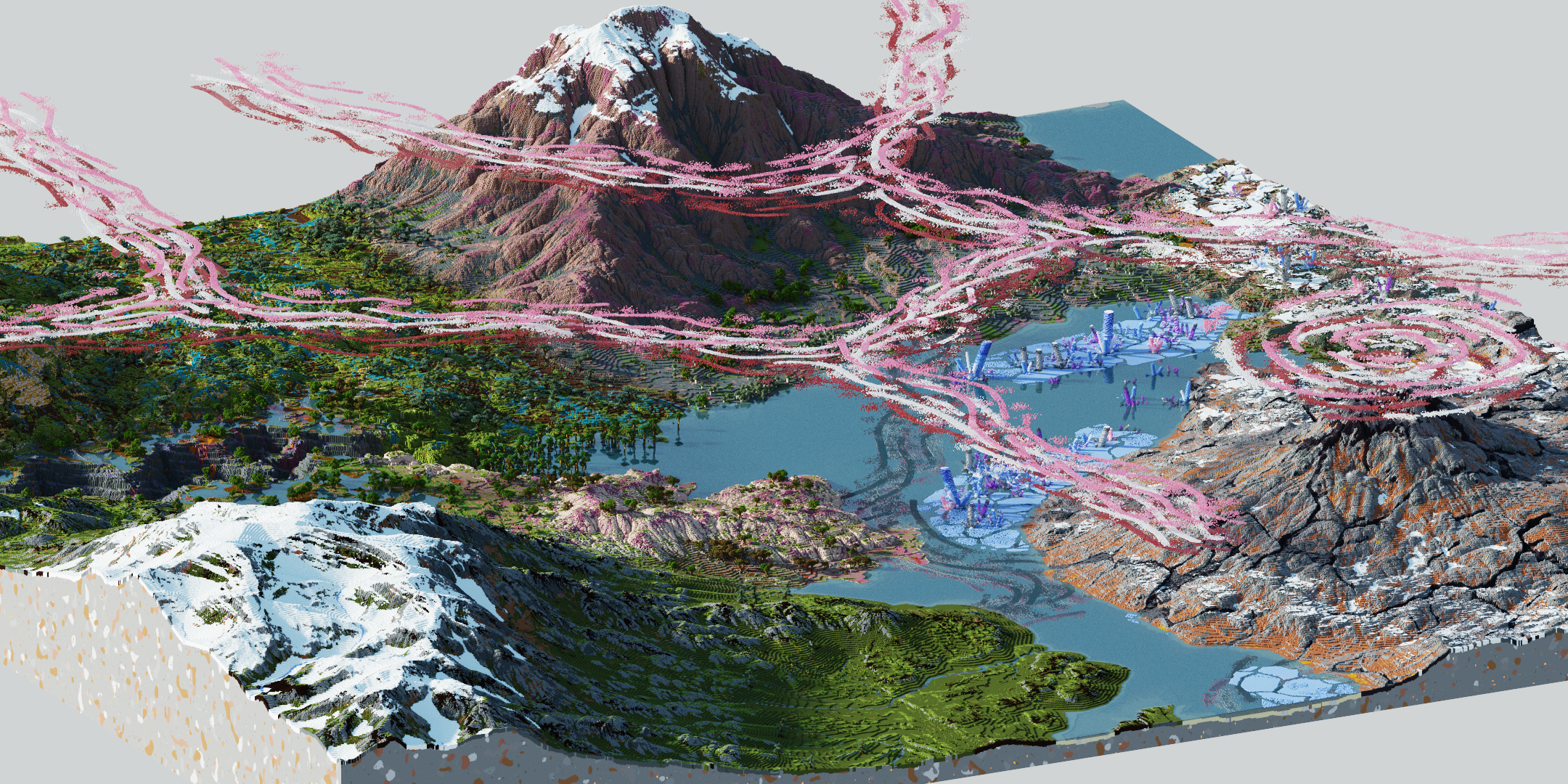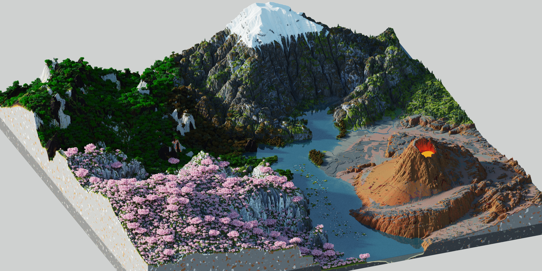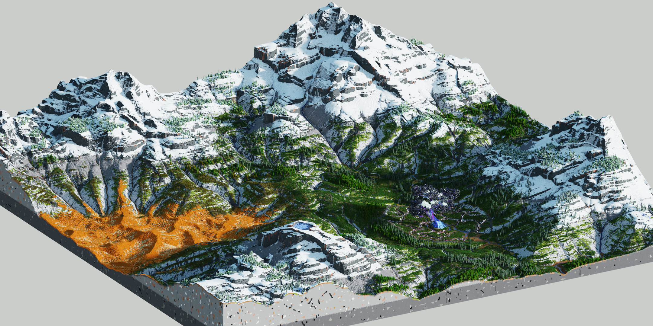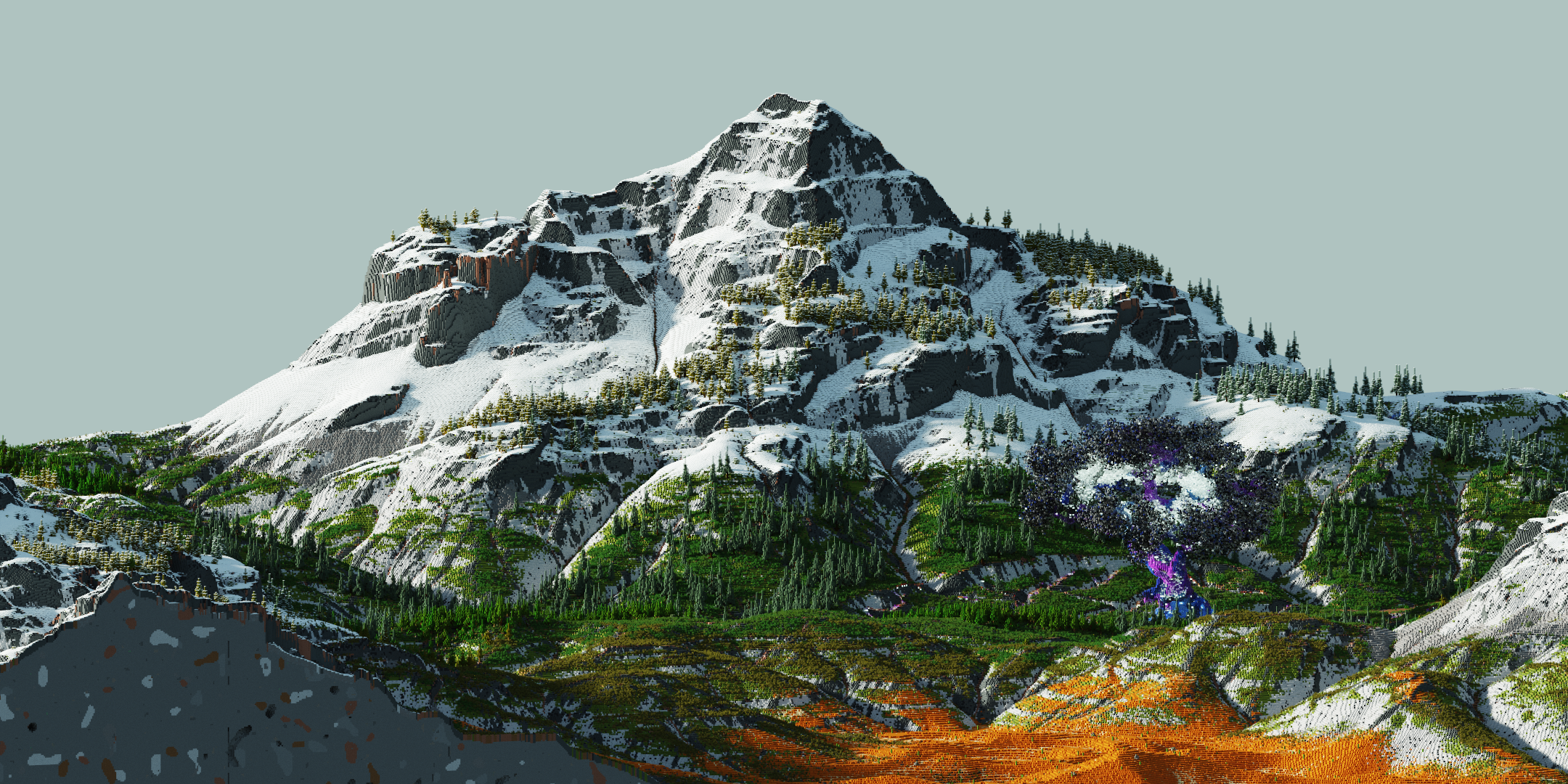 远山飘雪劲风吹,麓回温华荣叶随。漫天丽彩点风物,暗物幽隧长相墔。雄劲的地形纹理与绮丽的地形上色,加之大胆独特的魔法阵与富有生机的地下洞穴系统造就了这一地形。集创意与技术为一体,当之无愧的冠军作品。