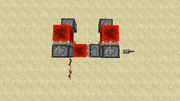 首先,红石中继器会退激活,这是因为它总是先于红石比较器更新。这会导致左侧活塞转变为非常规态。