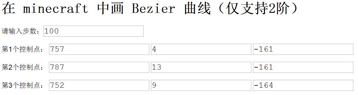 如果你觉得上述过程不能理解,你可以直接打开下面的网页,输入控制点的绝对坐标和拟合点的个数,即可生成一条命令,然后将该命令复制到命令方块中执行即可,最后敲到多余的方块。