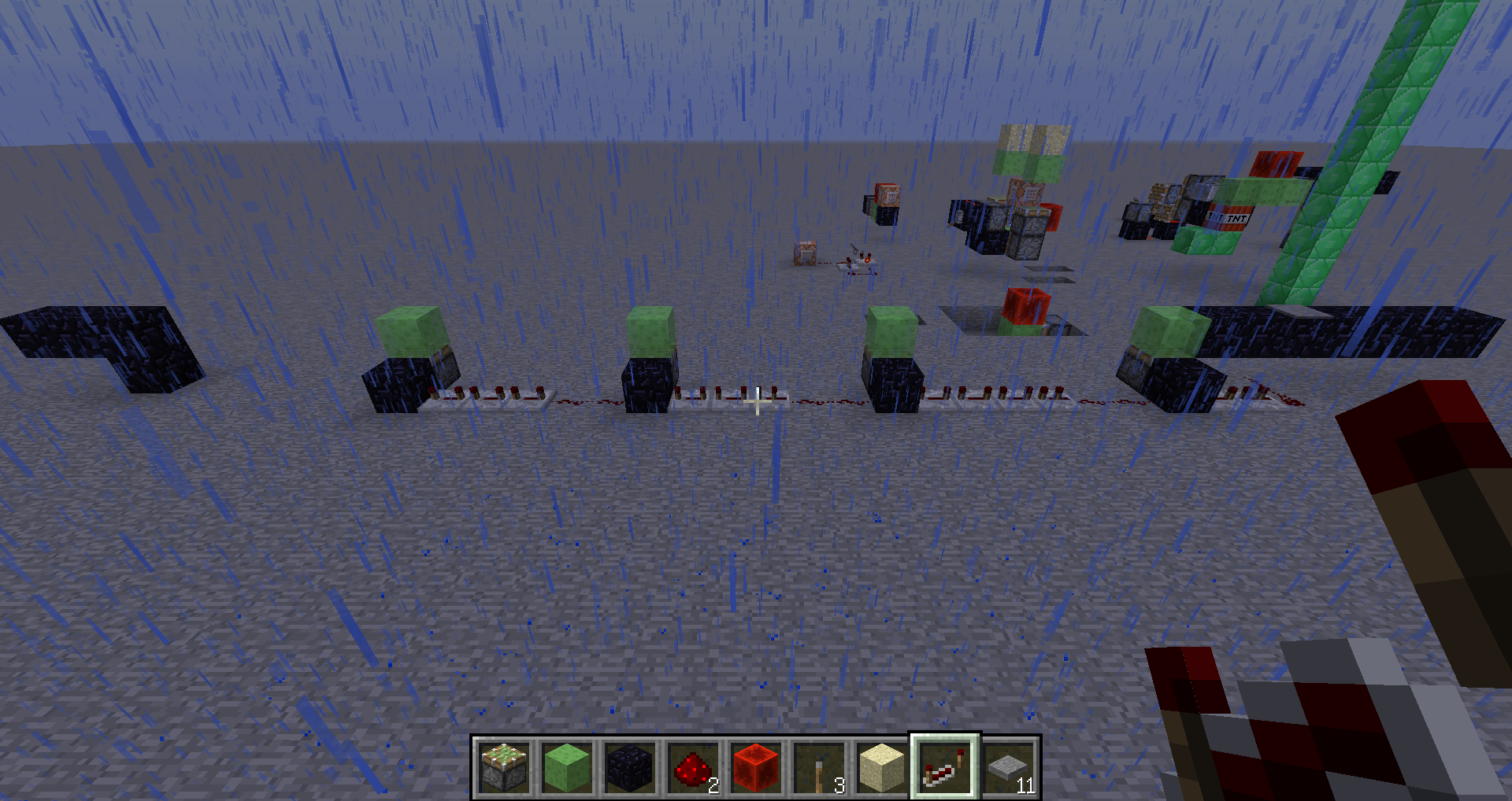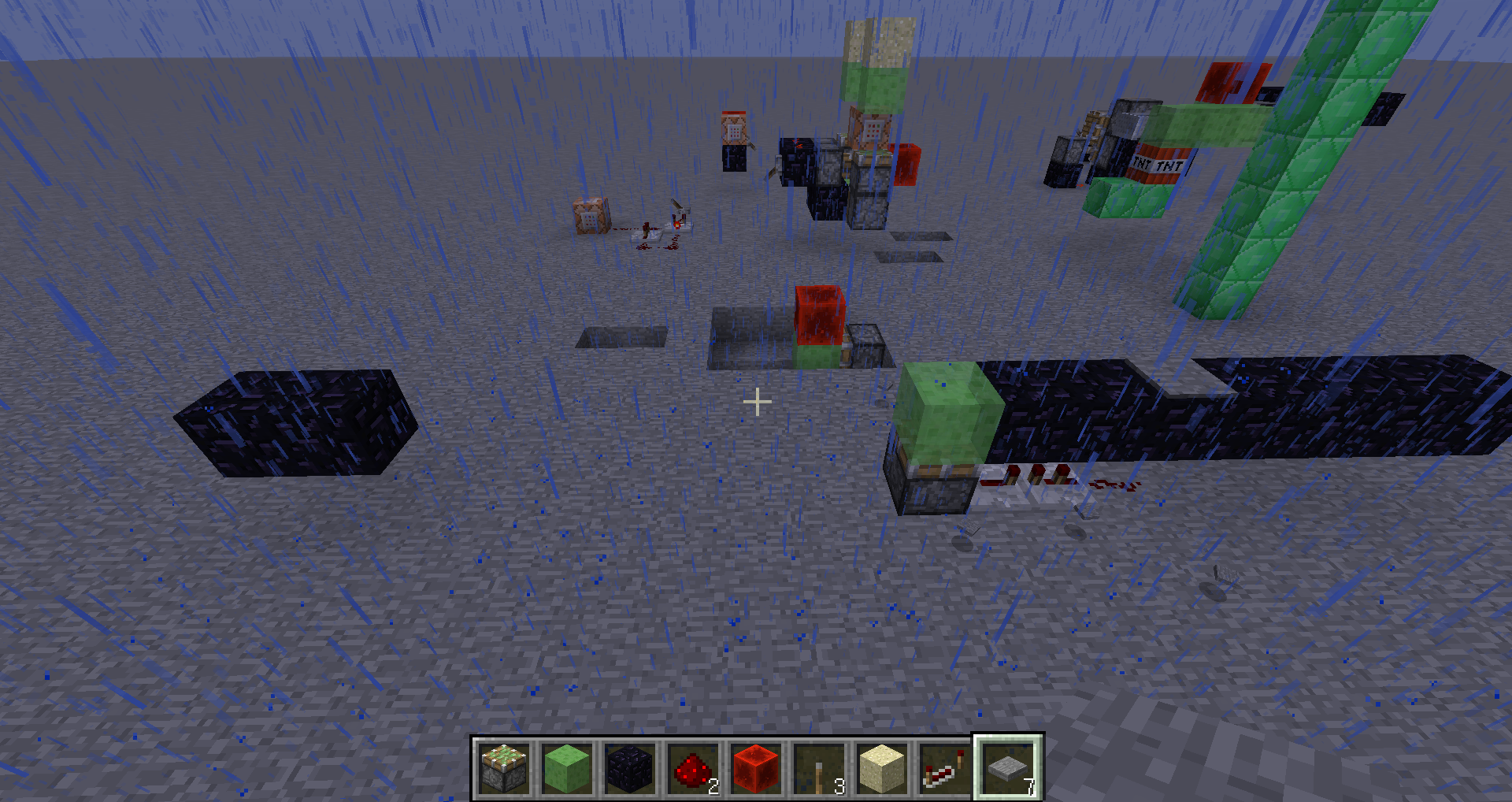 如图,粘液块和左边的黑曜石中间有7个空格,楼主试了好几次才跳了过去,没嗑药。如果觉得太难可以减少1个空格。