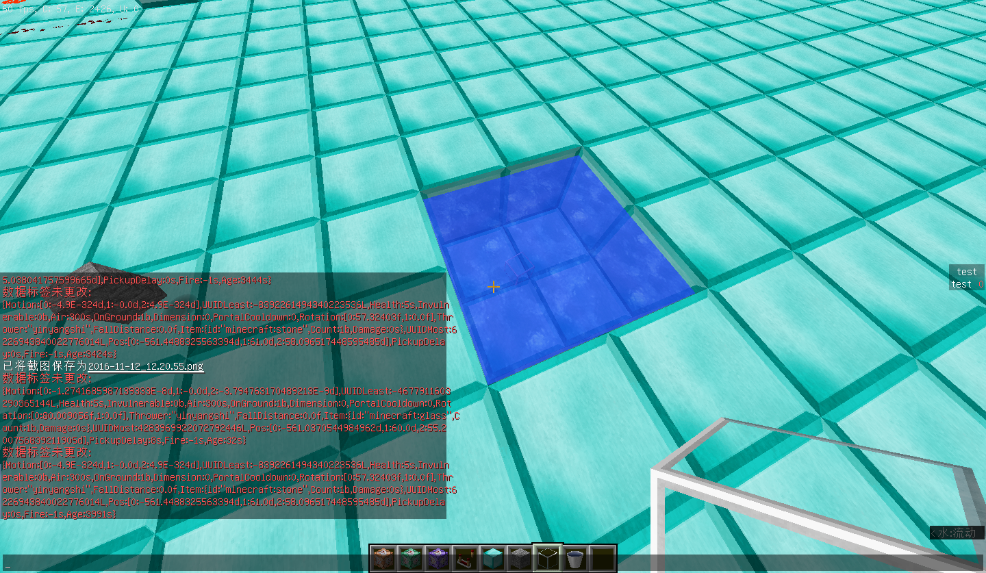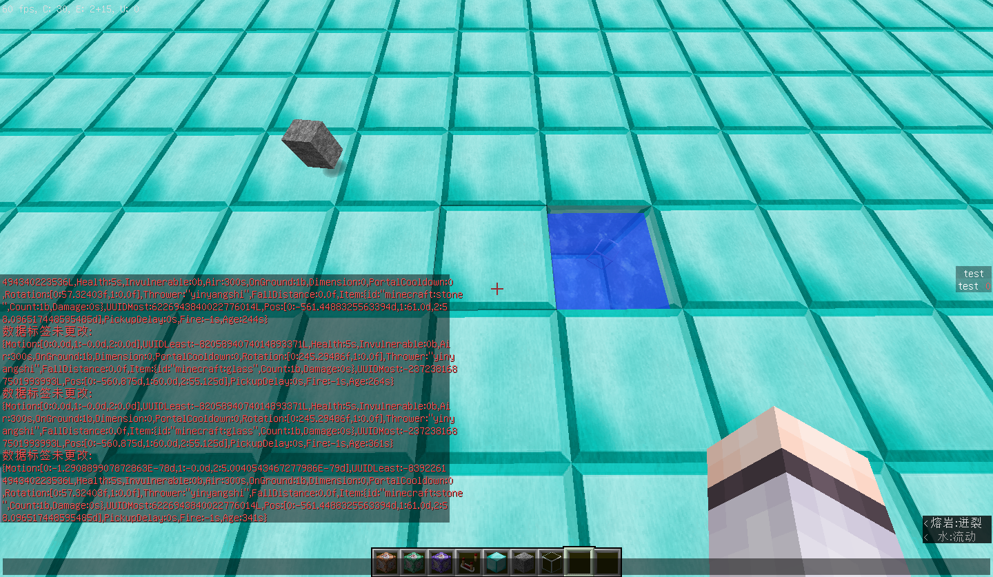 2,一般的掉落物能存在五分钟,5min后才消失,但是直接丢到水里的物品只能存在1min?我在1.10.2和1.9.4都测试了一下,好像是这样的——大约1min后物品消失,用entitydata查看,Age也确实是从4800多开始的。(但是如果我丢出物品后立刻用entitydata,即物品还未进入水中而还在空中时就用/entitydata @e[r=3] {}来查看它的nbt,会显示Age是从0开始的,并且进入水中后不会突变至4800多,即可以存在5min了。如果在未进入水中时不查看,那么浸入水中后只能存在1min)不知道是我的版本问题还是特性还是bug,求验证