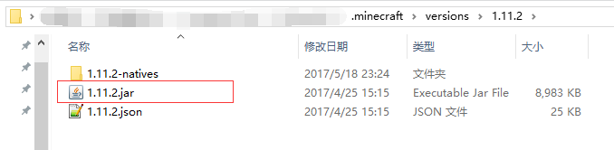 versions/1.11.2下的1.11.2.jar (游戏核心)(因为我是用的1.11.2,其他版本文件夹名称和文件名会不一样,根据版本号)