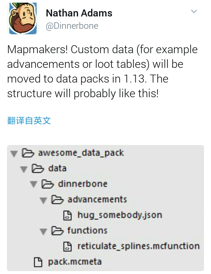 Dinnerbone:地图制作者们!自定义数据(比如进度或者是战利品表)将会在1.13移至data文件夹里。具体结构就像下面这样!