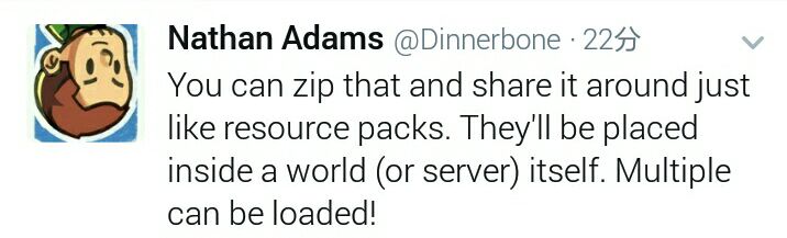 Dinnerbone:你可以把它们变成压缩包并像资源包那样分享。它们会自己被添加进世界(或者是服务器)。联机游戏也可以加载!