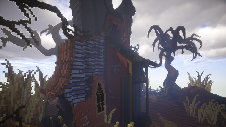 正是这样的细节才渲染了恐怖的氛围,使得这座建筑显得栩栩如生。扭曲的树木可能并不是建筑的核心,但正是这树林才将房屋主体笼罩在死亡与凋零之中。回望这座建筑,Oxide说,“树木和枯草着实为恐惧的氛围添彩。完工后,我自己都能体会到这恐怖的氛围,很高兴我最后成功地把这气氛摹刻了下来。”