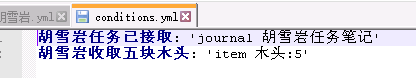 event.ymljournal.ymlconditions.yml&2. 结束————————————————————————————————————————————————————&2. 做一个随机对话      首先打开default文件夹中打开conversations文件夹创建一个对话      然后打开default文件夹中的conditions.yml      输入以下内容      这个的意思是当对话或任务使用到该条件时有1/2几率达成该条件      回到conversations文件夹中的对话文件      修改为以下内容      这样的话,但你回答NPC '有事吗'的时候,有1/2几率NPC回答你'没事'或'你过来一下,我给你看个宝贝'&3. 结束
