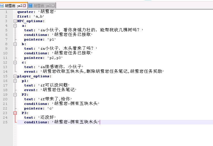 &1. 结束————————————————————————————————————————————————————&2. 做一个物品交付重复任务      首先打开default文件夹中的conversations文件夹中的代毕.yml      然后再打开default文件夹中的event.yml和conditions.yml和journal.yml      先到代毕.yml的对话文本中修改对话      下来,设置条件来限制这两条对话      打开event.yml      第一条event的意思是添加一个笔记名字为 代毕任务笔记 的笔记      第二条event的意思是删除一个笔记名字为 代毕任务笔记 的笔记      第二条event的意思是执行一条指令 eco give %player% 100(%player%为玩家变量)      打开journal.yml      笔记名: '笔记内容'      打开conditions.yml      这条conditions的意思是 如果拥有笔记名为 代毕任务笔记 的笔记      那你就拥有条件 代毕任务已接取      回到代毕.yml      在NPC_options对话下的a添加上 conditions: '!代毕任务已接取'      代表的意思是,当玩家没有条件名为 代毕任务已接取 的就可以触发这个对话      (小写感叹号代表没有,没有小写感叹号代表有)      再在NPC_options对话下的b添加上 conditions: '代毕任务已接取'      再在player_options对话下的p1添加上 event: '代毕任务笔记'      代表的意思是: 当使用到这个对话的时候,触发事件名为"代毕任务笔记"的事件      然后在游戏中手持木头输入指令: q item 木头      然后在conditions.yml中写上      代毕-拥有五块木头: 'item 木头:5'      代表的当玩家背包中有五个木头时,拥有条件'代毕-拥有五块木头'      再在event.yml中写入      代毕-收取五块木头: 'take 木头:5'      代表的意思是从玩家背包中收取五块木头      (这里的木头是你之前输入指令时设置的,所需的物品是你之前输入指令时手持的物品)      回到代毕.yml      在player_options对话p2添加上 conditions: '代毕-拥有五块木头'      代表的意思是: 但玩家拥有五块木头的时候,开启该对话      再在player_options对话p3添加上 conditions: '!代毕-拥有五块木头'      代表的意思是: 但玩家未拥有五块木头的时候,开启该对话      再在NPC_options对话c添加上 event: '代毕-收取五块木头,删除代毕任务笔记,代毕任务奖励'      代表的意思是: 执行事件"代毕-收取五块木头删除代毕任务笔记代毕任务奖励"