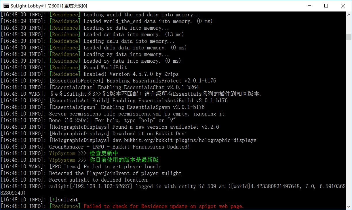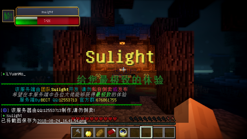 | 声明: 本端由SuLight团队制作,且允许使用于任意服务器(请更改服务器名称等信息)。 注意:    ●  使用本端请注明作者    ●  请尊重团队劳动成果,禁止随意转载    ●  服务端内的氪金系统请酌情改价格    ●  切勿修改本端后进行倒卖,标榜原创. 更多SuLight团队作品 > [1.8-1.12][PaperSpigot]反抗精英 —— 体验当年枪林弹雨的刺激!       http://www.mcbbs.net/thread-784498-1-1.html > [1.8-1.10][PaperSpigot]TNTRun —— 快跑!小心掉下去![一端一图]     http://www.mcbbs.net/thread-791613-1-1.html > [1.12][PaperSpigot]守望先锋 —— 在MC里来体验一局守望先锋![一端一图] |