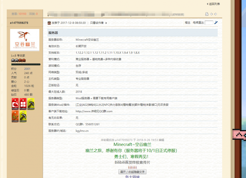 我在原帖内也特意表示并非宣传,而且目前服务器已经完全停止服务(帖子的意义主要是回忆自己参加mcbbs活动,以及创建服务器的经历,发发锭庆祝一下升8级,并非宣传)