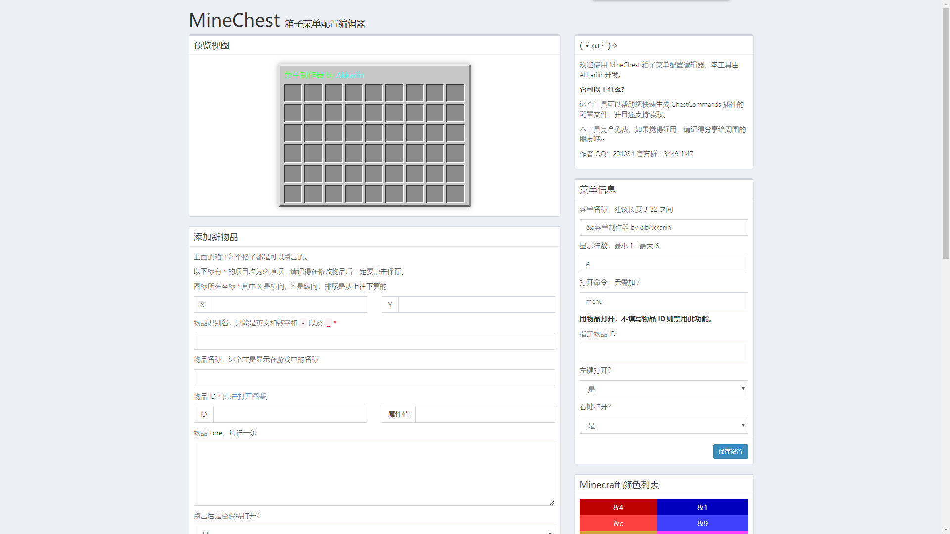MineChest 是本人开发的一款支持编辑 ChestCommands 插件配置文件的编辑器,使用 HTML5 + PHP 开发。