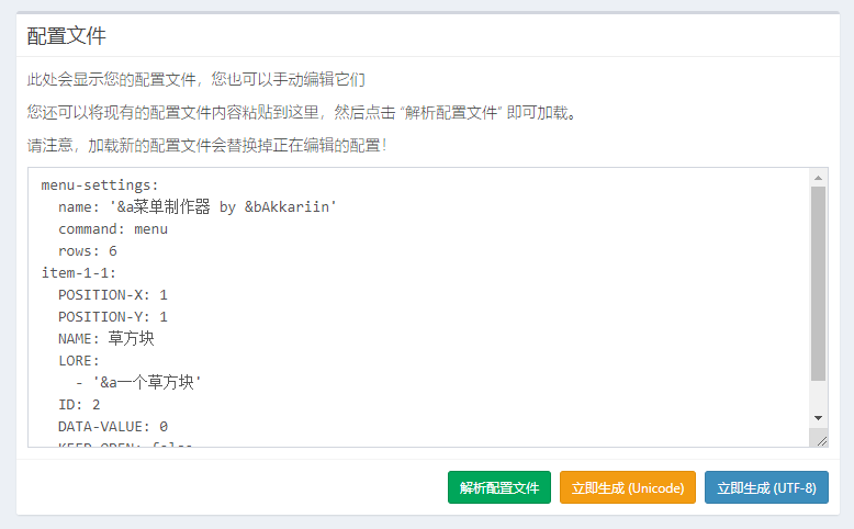 您可以用它来方便快捷地制作一个 ChestCommands 插件配置文件,或者是读取配置文件并修改。