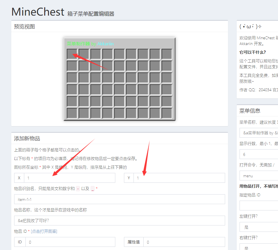 我现在使用的是旧版的ChestCommands插件,所以配置文件都是旧的,但是我吧新版插件换上去的时候,提示了很多乱码,我觉得应该是编码的问题,我那个使用软件做的,全是U码,不是文字,所以我不得不用您开发的这款网页版编辑器,首先,我想复制粘贴一个图标的时候,非常麻烦,然后就是,我希望作者能弄快捷键,比如按住某个键点击格子就能复制进去,然后就是一些符号,希望能在旁边列举,总体来说很棒,有一些小细节需要改进,比如我刚才说的复制粘贴,我也是试着跟进一步的了解这个编辑器。