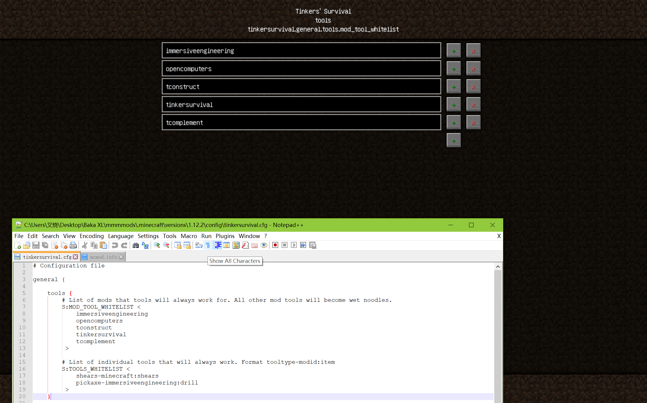 下图为匠魂生存的配置界面某页,在添加白名单后碎矿锤仍旧使用不能(奇怪的是无中生有C的钩子倒用得挺好....匠魂补充与无中生有C联动带的锤子却不能用....