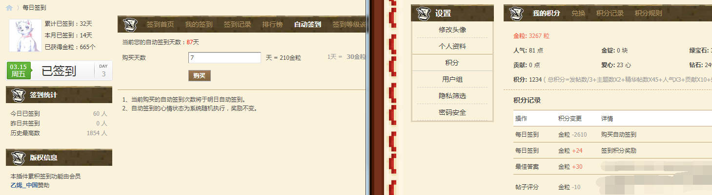 可能是管理员觉得10金粒自动签到太赚,又改回去了(幸好我手快,6300买了630天)