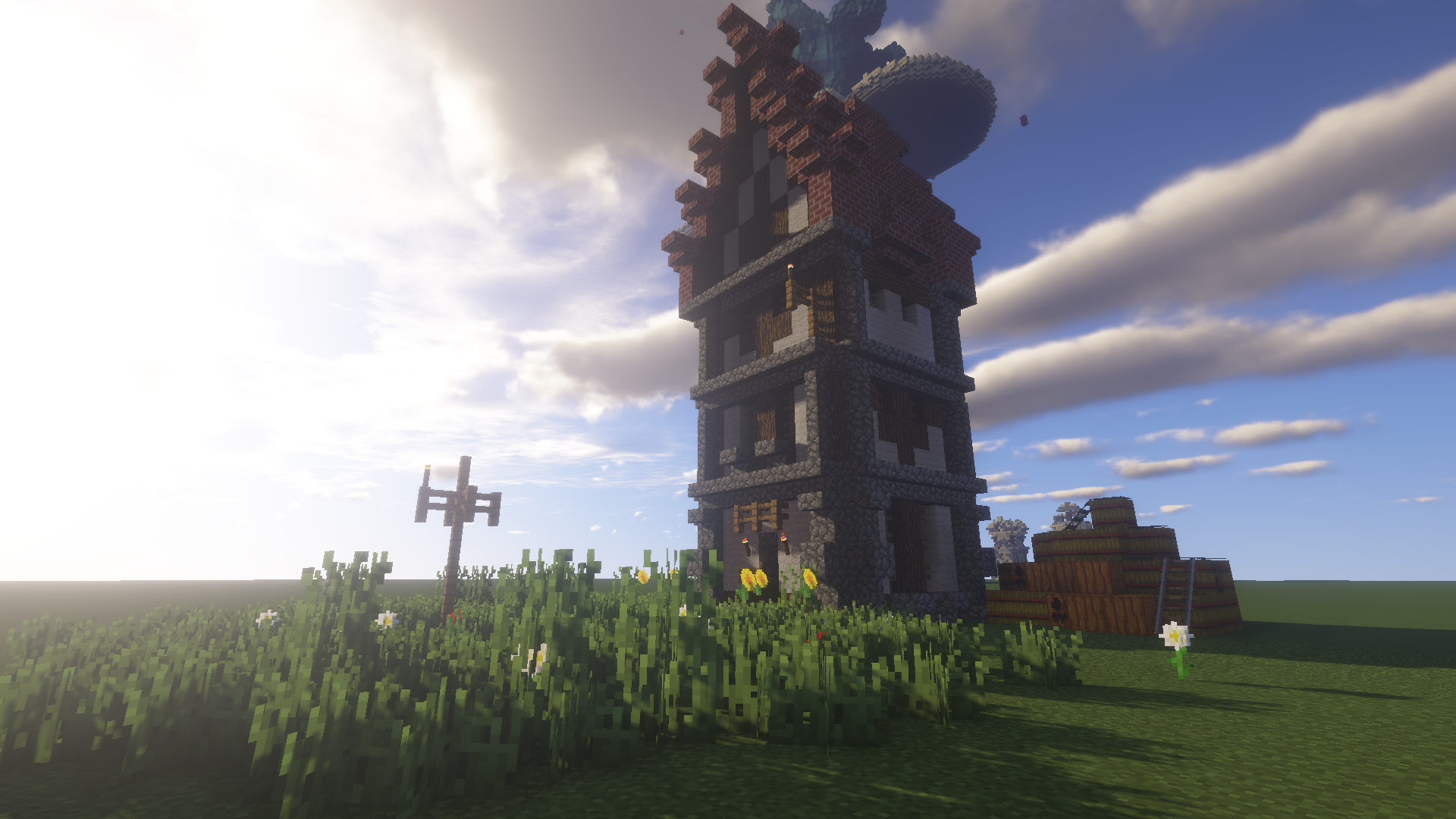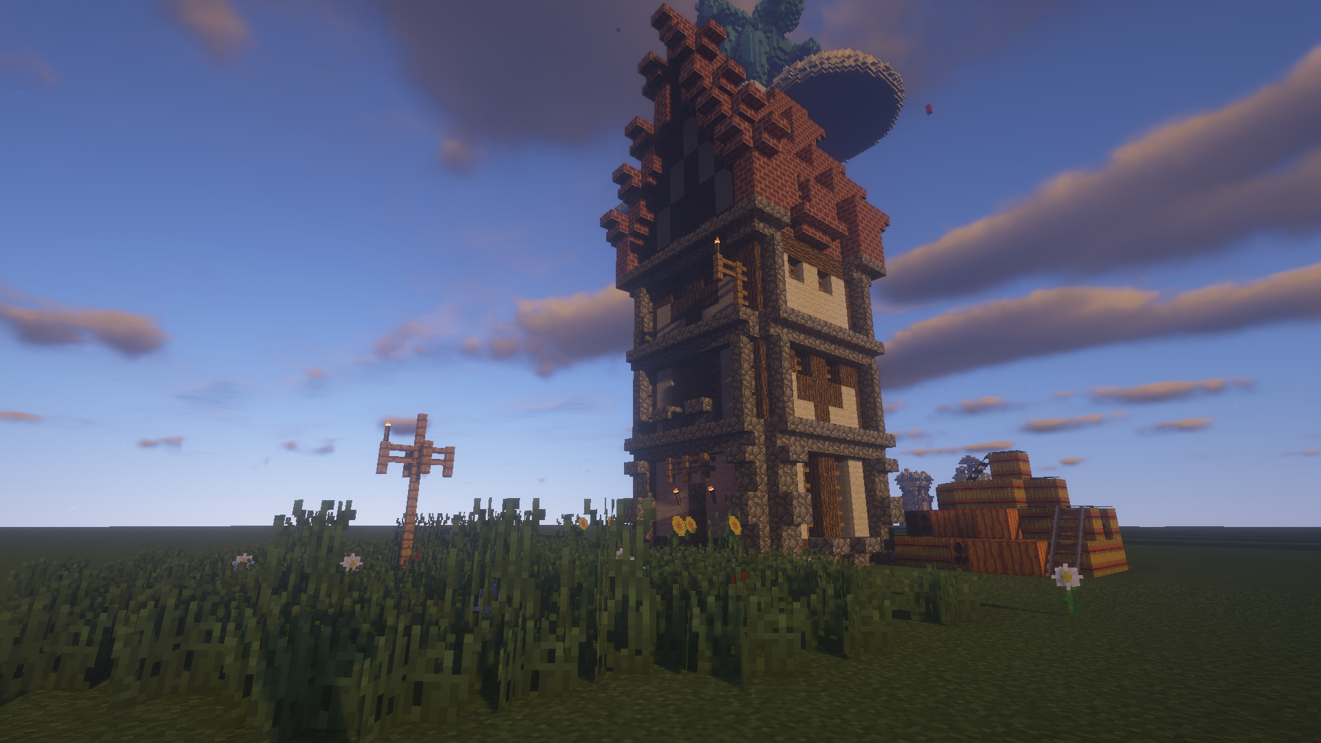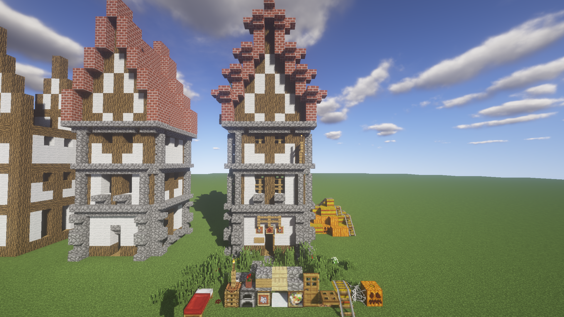 搭配圆石路和骨粉草地,屋顶小花园阳台以及稻草堆,充实建筑,使更加风格化